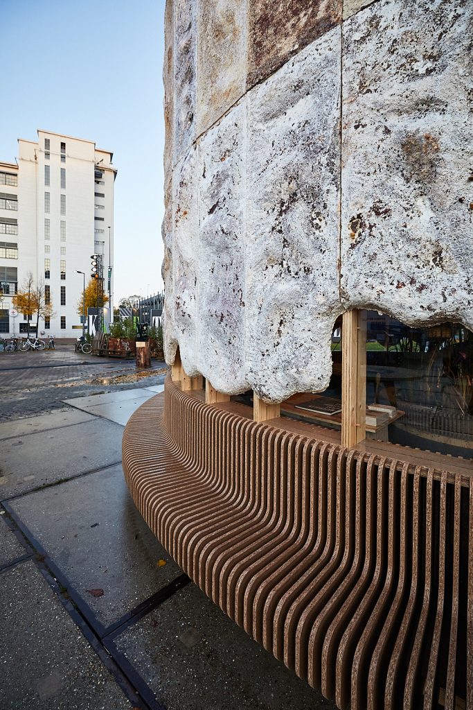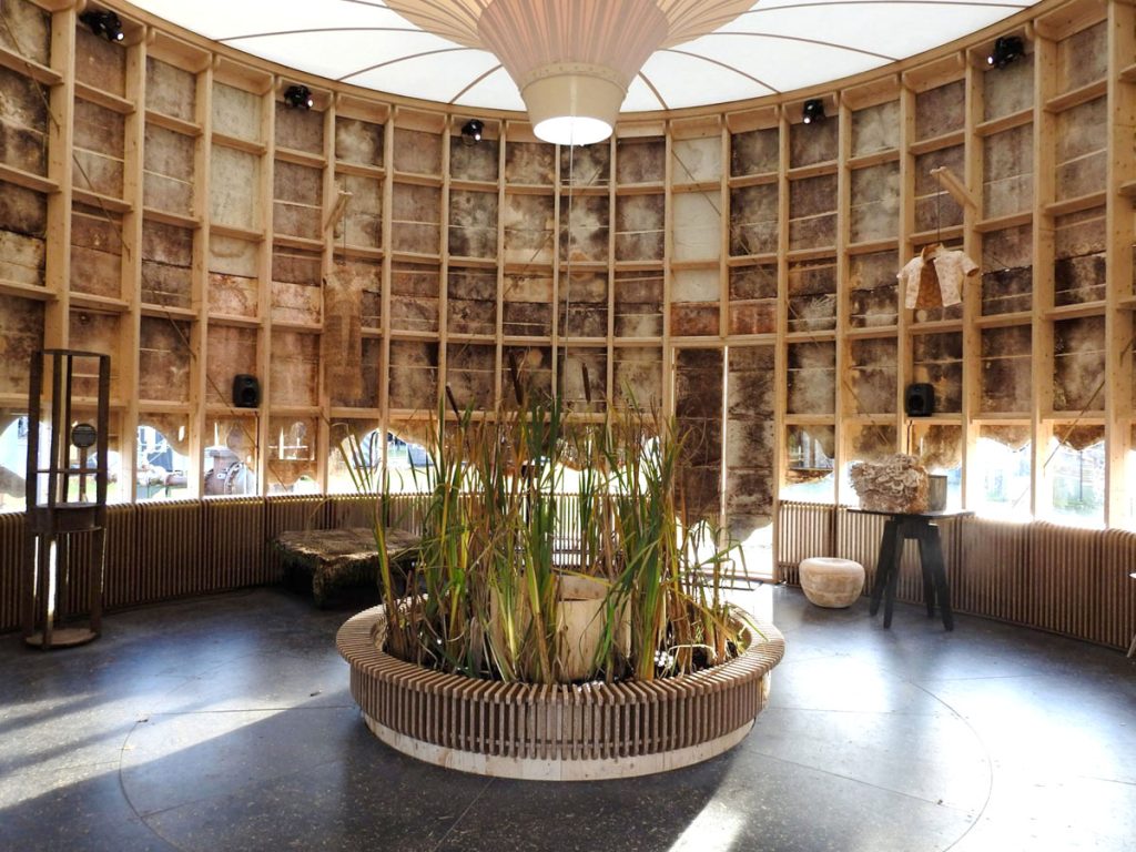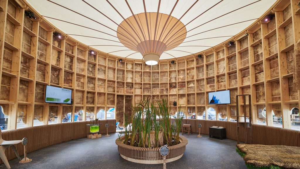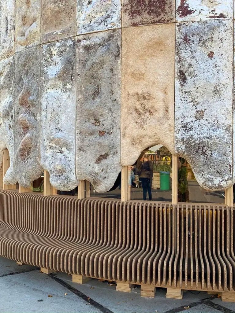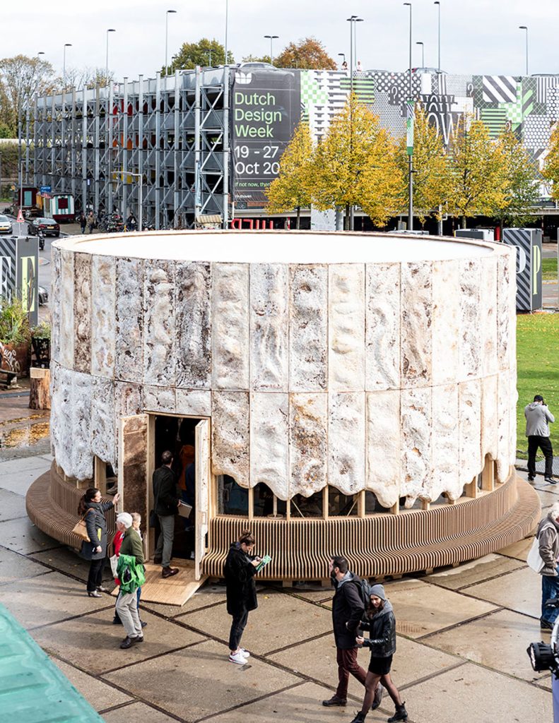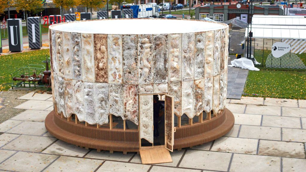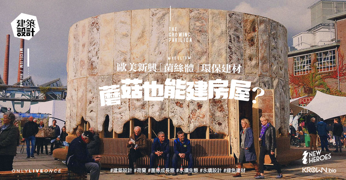 多年前,荷蘭初創組織 New Heroes 曾攜手生物科技公司 Krown Design 合建一座實驗性的「菌絲成長館」(The Growing Pavilion)。整座建築以木材及壓縮香蒲板等生物基材料製作,每處牆壁則密佈菌絲體;館內,還展示了用菌絲體和康普茶等製成的衣服,每日亦會邀請民眾採收新長的香菇作食材,開闊人們的認知和想像。