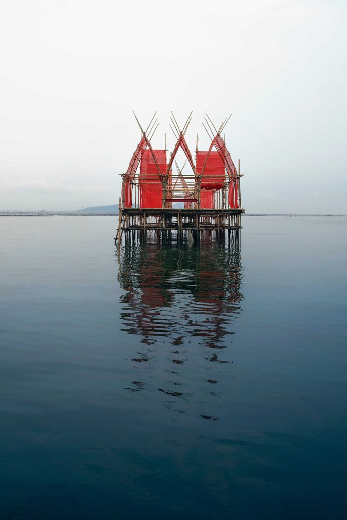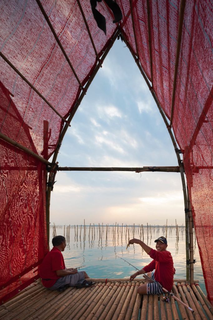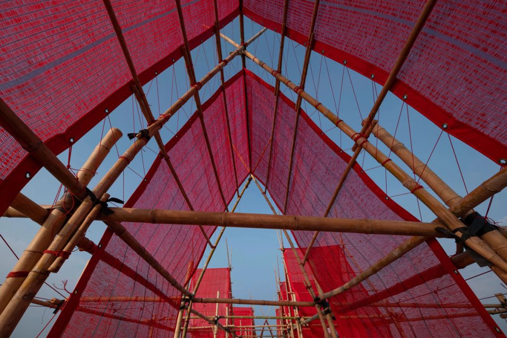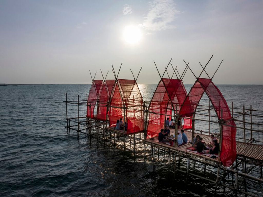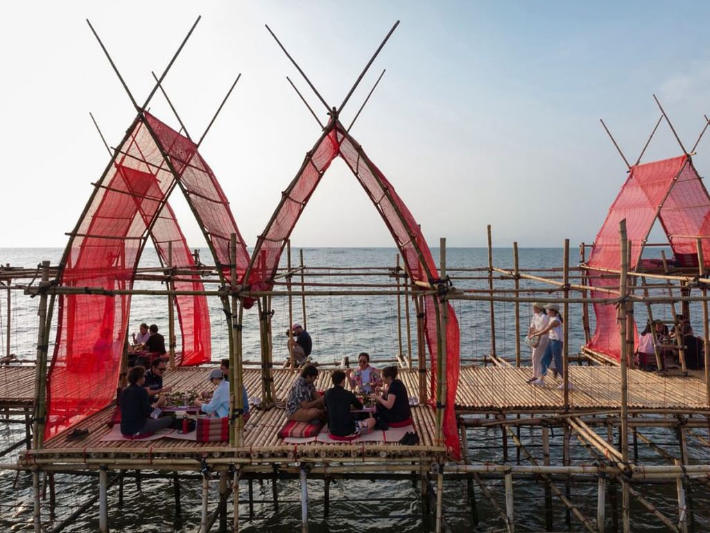 擅長在地營生的 Chat,鼓勵漁民向朱拉隆功大學的建築設計系學生傳授搭蚵棚技藝,共建「牡蠣養殖竹鷹架廊亭」尋出路。他們訂製當地的竹子,以人力踩跳取代電鑽,將之插入海床深處;再用廢棄的座椅安全帶連結竹子結構,成功做到防水防鹽又堅韌,並以低簾的塑膠布搭成遮陽屋頂。