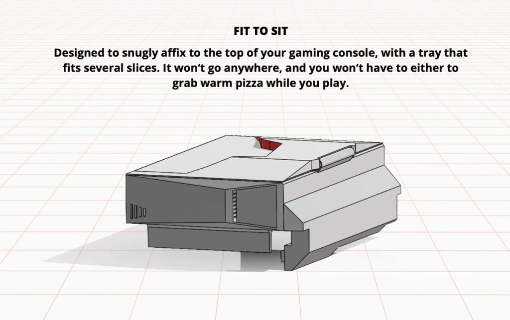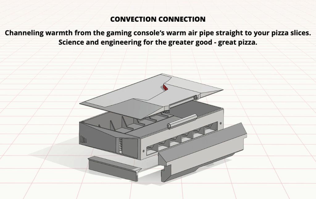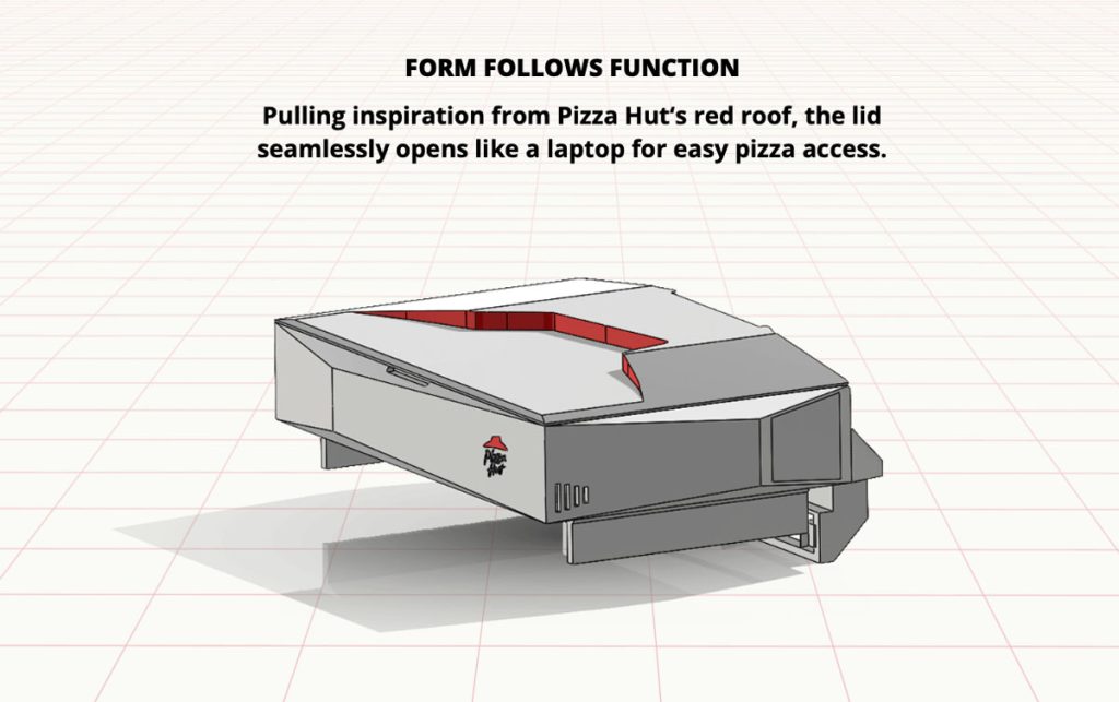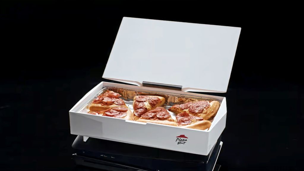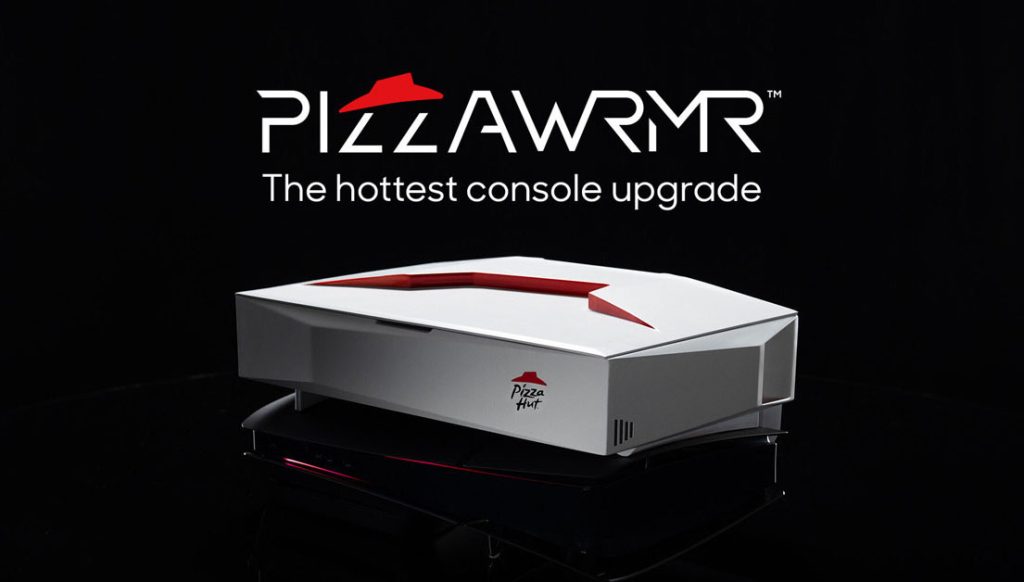 惟薄餅放涼會令口感遜色,也間接影響品牌形象,Pizza Hut 加拿大行銷團隊就創意攜手 Sony 設計 PIZZAWRMR 包裝盒,專門安裝在 PS5 機台上,借機身餘溫延長外賣薄餅的保溫時間。盒子的設計靈感,源自 Pizza Hut 深入民心的「紅帽小屋」建築和 logo,並模仿舊式電玩控制盒的結構,尺寸長闊 29 cm 高 3.3 cm,盒蓋可如筆電般流暢開啟,盒內可放數件薄餅,底部則有錫製底盤及風管將機台暖風導入盒中,不必插電即可安全為食品恆溫,呼應其名——時刻保持薄餅熱度,為人呈獻美味。