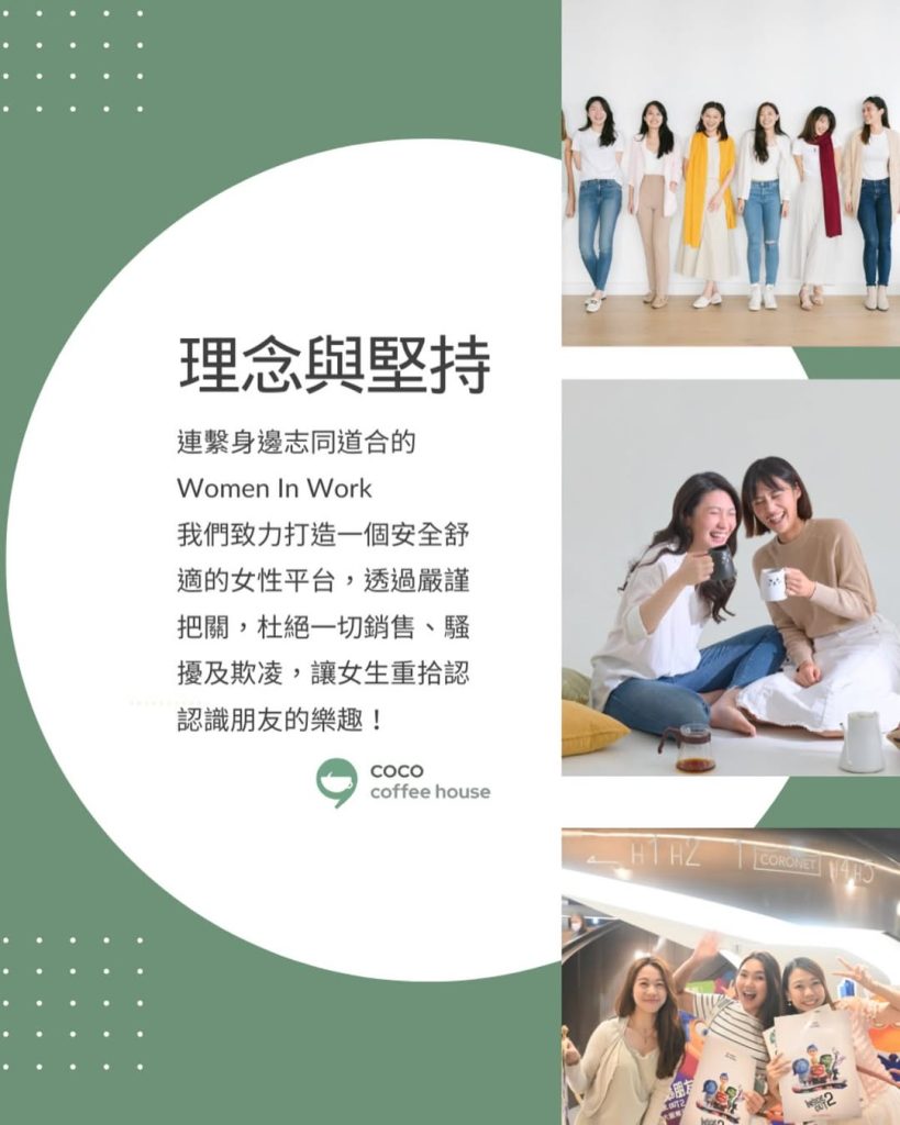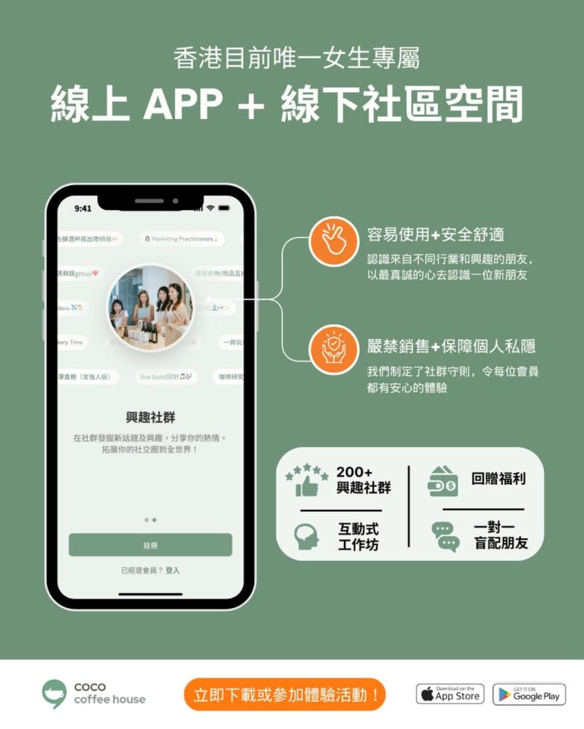 另一個是本地專為女生而設的 Coco Coffee House,強調不受外在束縛及可安心聯誼的社群 APP。程式依據英國心理學教授 Anna.C. Campell 研究,「女性建立友誼的方式,特別着重同理和回應他人需求」,規劃一系列線上及線下交流活動。你可按個人需求選擇會員計劃,以專屬的 1 對1 聊天室內識人,或加入不同興趣群組及定期聚會,如芳療體驗、旗袍之夜等,並在「禁止任何營銷、直銷或招攬下線等行為;禁止發表仇恨言論、霸凌和騷擾其他人」等規例下,多方位認識不同領域的女性,或從中探索自己的未知面向或喜好等。