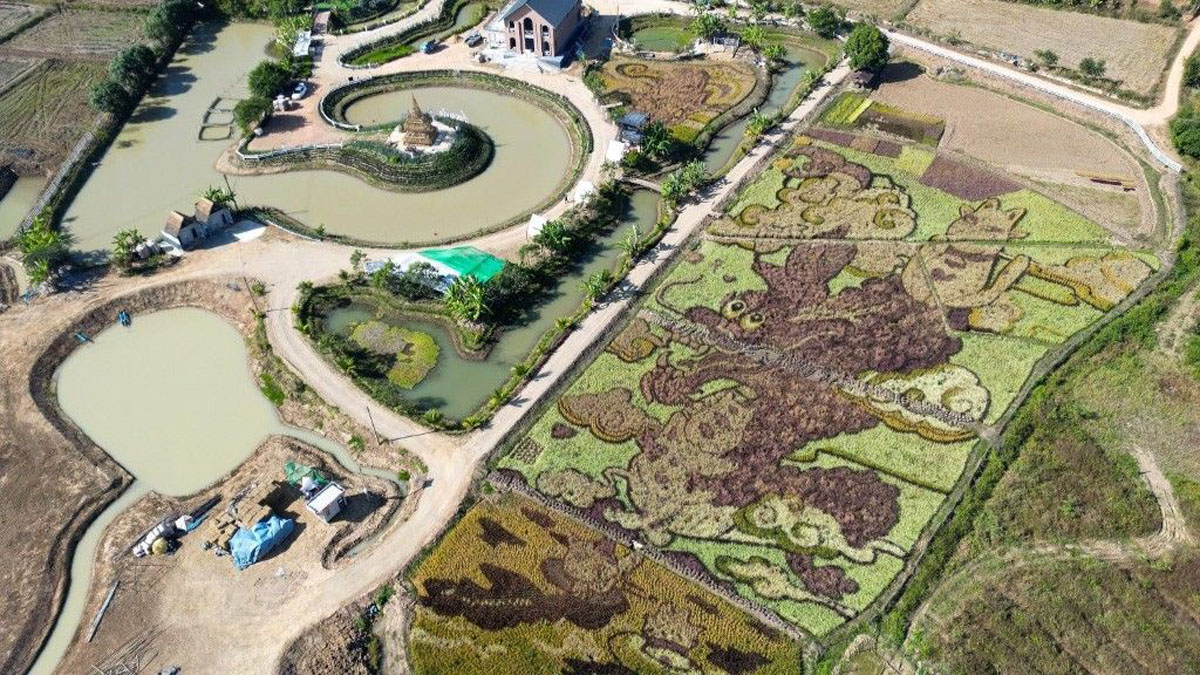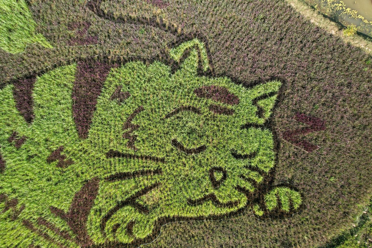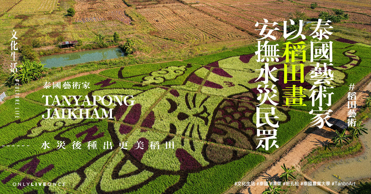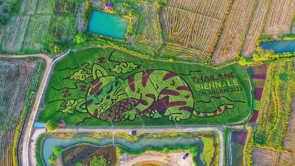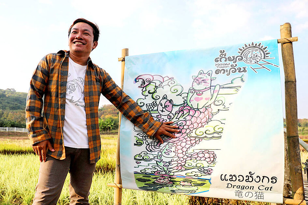 泰北清萊班孔松(Ban Khon Sung)的稻田之上,多幅壯麗的「紅色巨龍」和「吉祥貓神」等稻田畫作,皆出自藝術家 Tanyapong Jaikham 及義工們之手。Jaikham 創作之外,平日還會上班及務農,多年前他開始醉心研究日本稻田畫,嘗試用不同品種及顏色葉子的水稻「繪製」作品,觀察其四時轉換的色調及形態變化,以及怎樣結合先進技術和傳統農業技術來加強創造力。