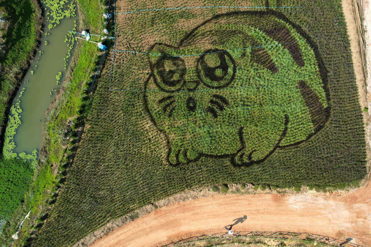 稻田現共「種」出一幅紅色神龍畫、三幅以 Jaikham 愛貓 Cooper 為主角的「貓咪圖」,當中點題之作可見貓咪手抱魚兒在熟睡,靈感取自泰國諺語:「水中有魚,田裡有米」,祝福當地農民再迎來「魚米豐收」好時光,也願將災禍轉化成希望,同心改進農業及旅遊業。