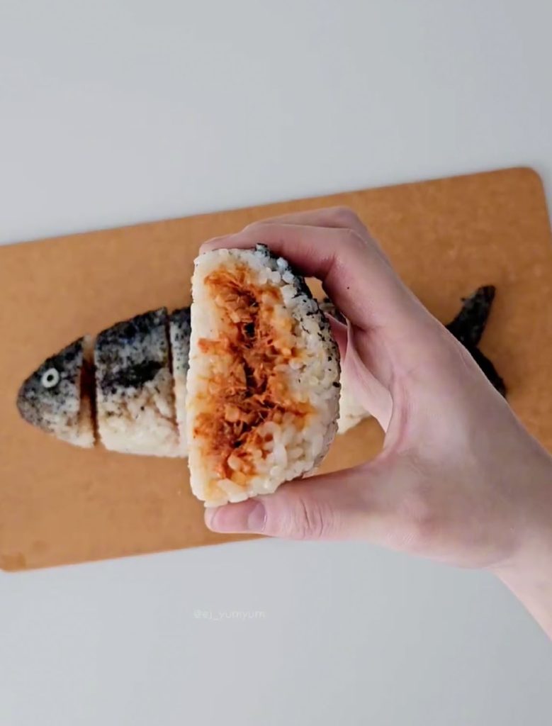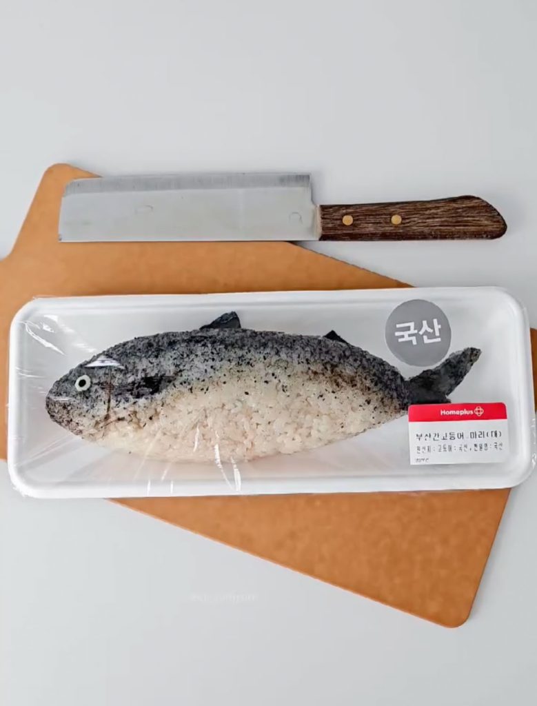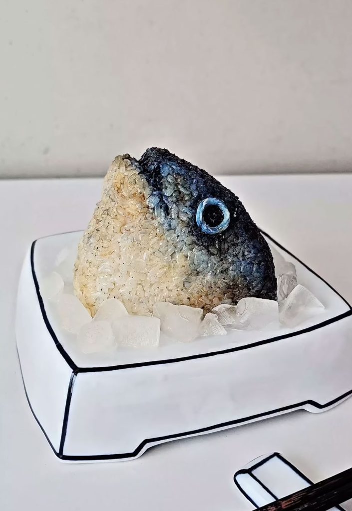 譬如,去年愚人節的「鯖魚飯糰」系列大獲好評。EJ 將米飯捏成有頭有尾的「魚體」,再以蒜味麻油調配富光澤感的「魚鱗」,拿刀將之切開後,則可見內部由辣味鮪魚拌蛋黃混成、呈橙紅狀的「魚肉」和「內臟」,若將整條鯖魚飯糰用保鮮紙包好、擺放到超市冰櫃,絕對看不出破綻。