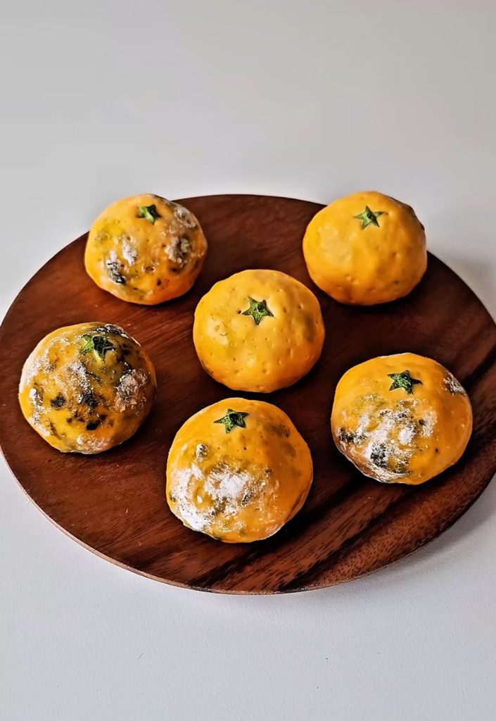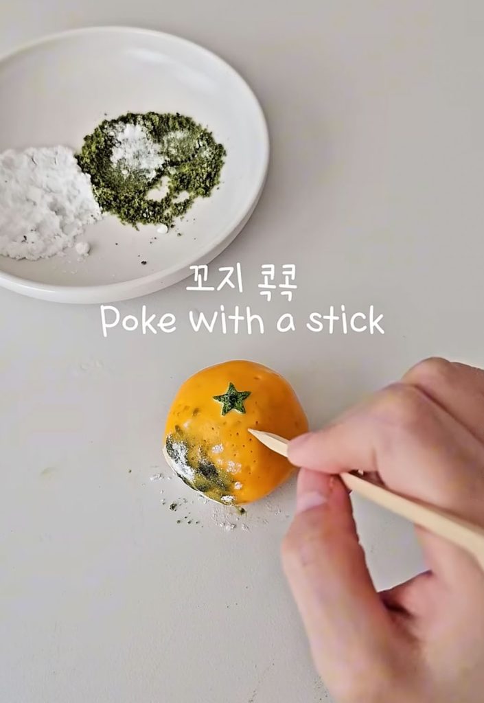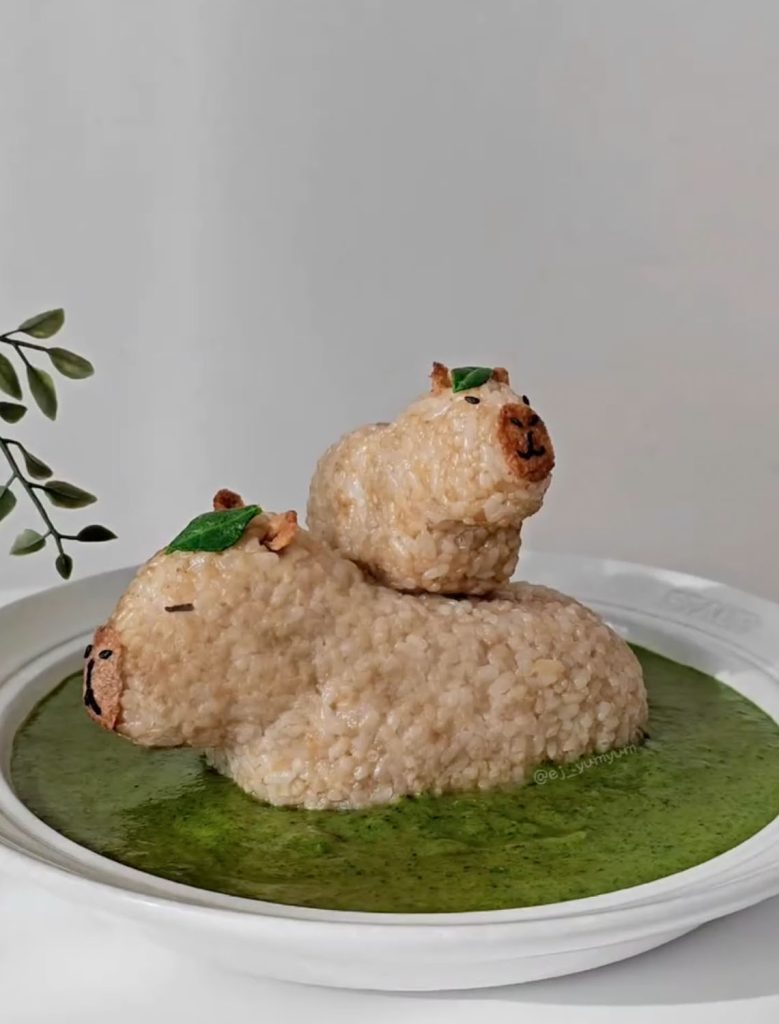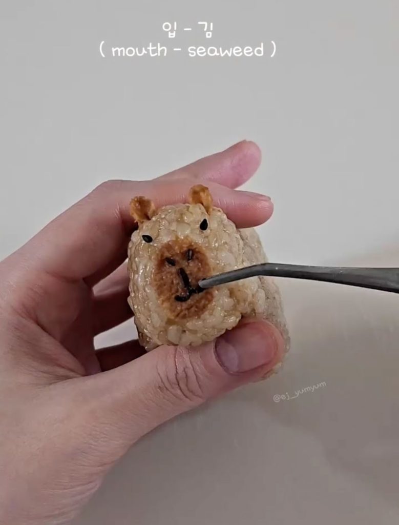 「爛橙飯糰」受潮濕的春季啟發而想。EJ 先把芝麻油和泡菜炒飯捏成球狀內餡,再包裹上一層黃色芝士作「鮮橙皮」,以玉米粉及菠菜粉混合物造成「綠葉」,以及沾在橙皮表面裝成「霉菌」。人們從圖片看暗綠霉菌爬滿整個橙,或會食慾盡消,可是若見飯糰實物,嗅到芝士及炒飯的濃郁香氣,可能忍不住口想大啖幾個。另外,留意年輕人常自嘲「社蓄」,羨慕水豚整天窩在溫泉的慵懶快樂,EJ 又以醬油拌飯配菠菜炮製「水豚飯糰」系列,還有其他精靈的卡通動物飯糰系列,治癒人心。
