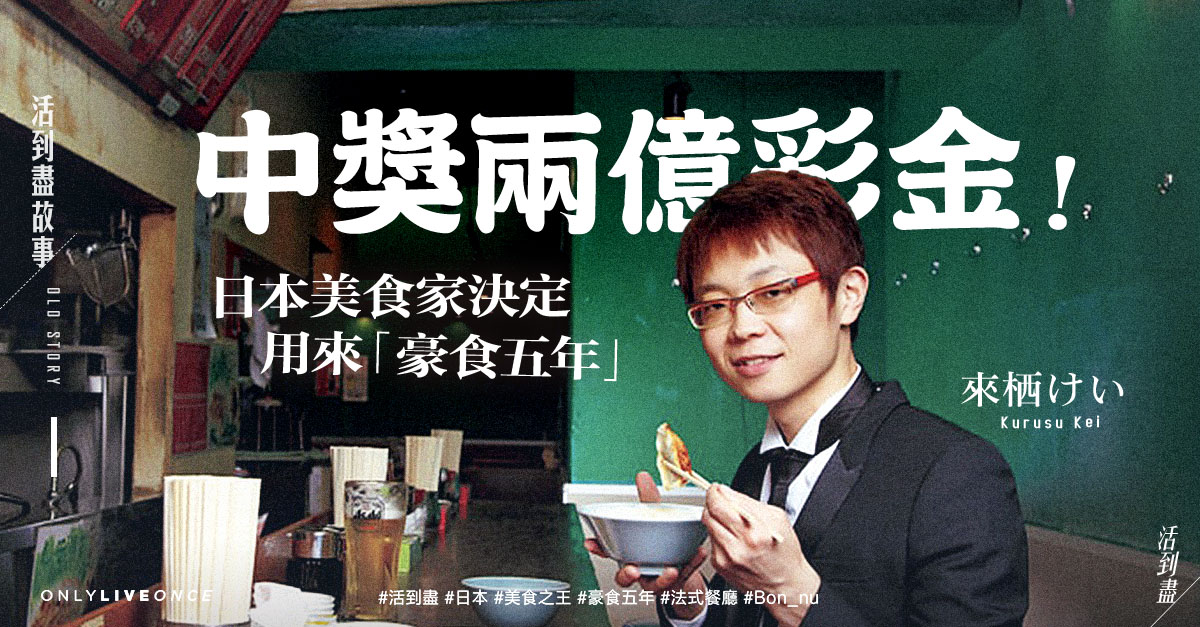 中頭獎等於「幸運」?歷來不乏幸運兒一夜暴富後,因不善理財、親朋反目等下場悲涼。日本男子來栖けい(Kurusu Kei)有先見之名,於 20 歲贏得兩億日圓巨額彩金後,選擇低調地投資自己和未來——他花五年光顧國內近兩萬間知名餐廳,再將「吃光巨款」心得撰寫成食評《美食的王者》,並開辦「單一料理」法式餐廳 Bon.nu,使一時運氣拓展為長遠的實力。