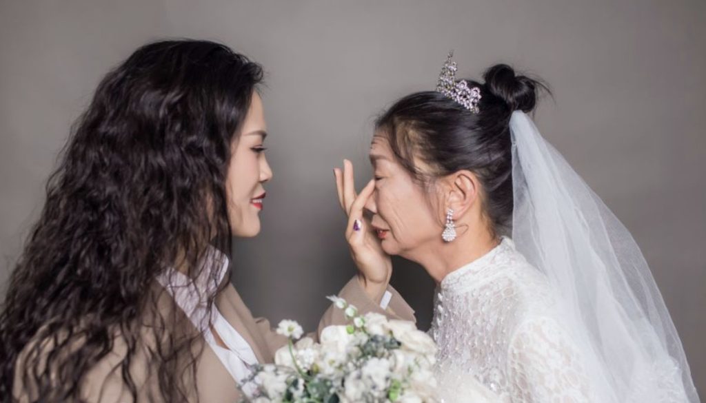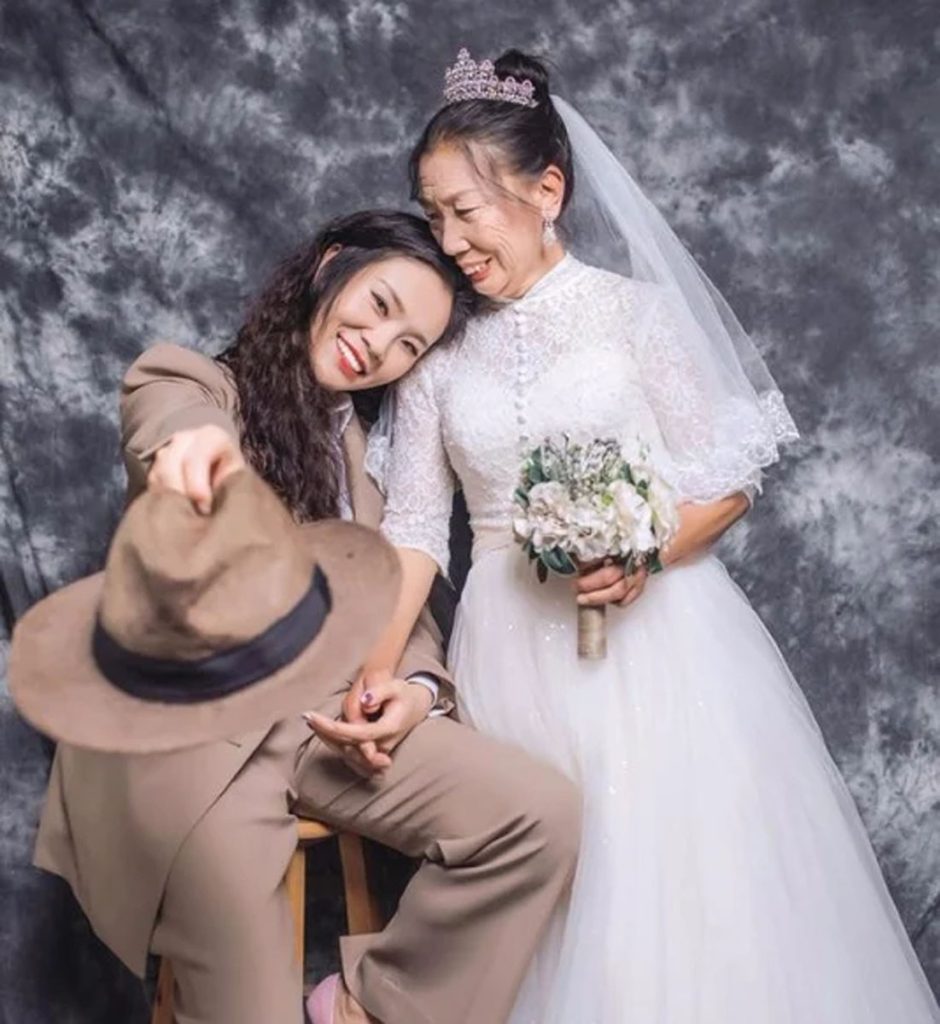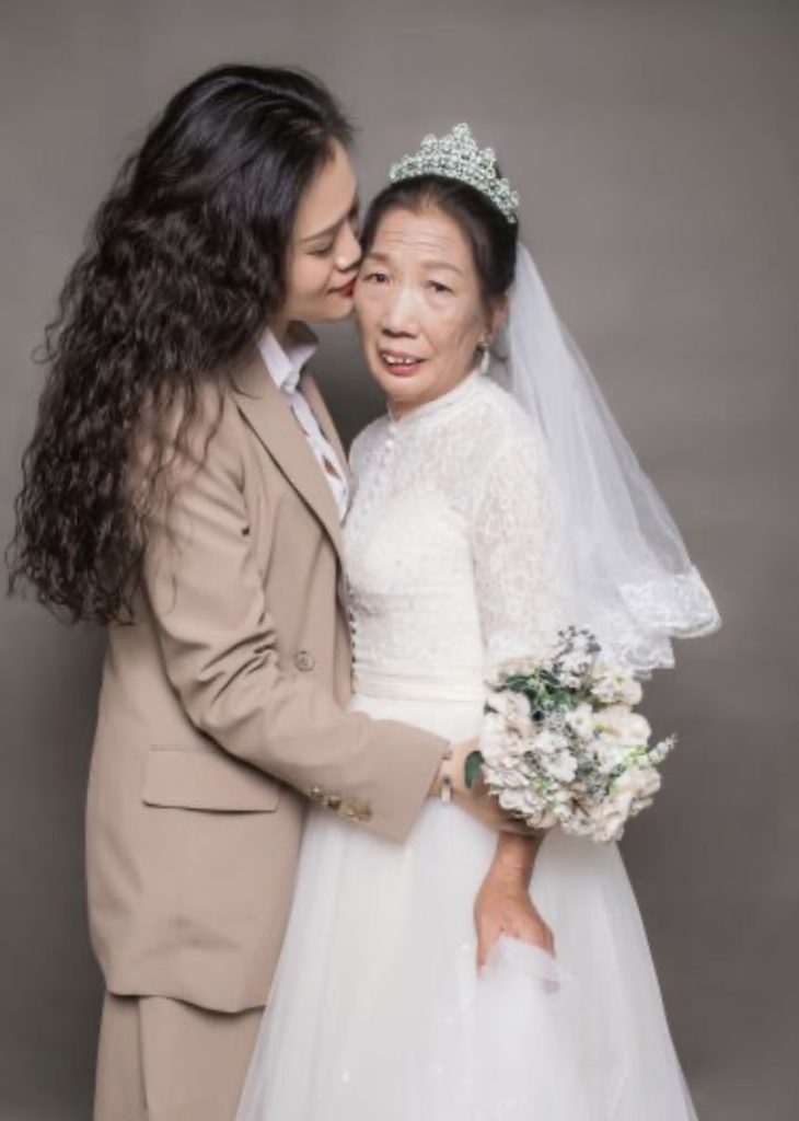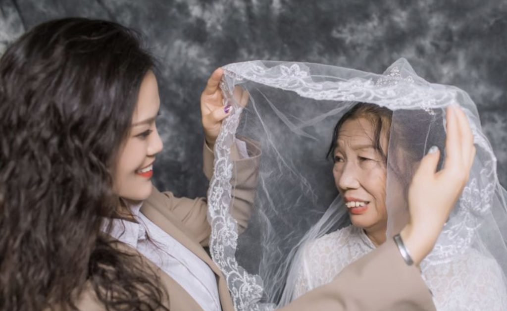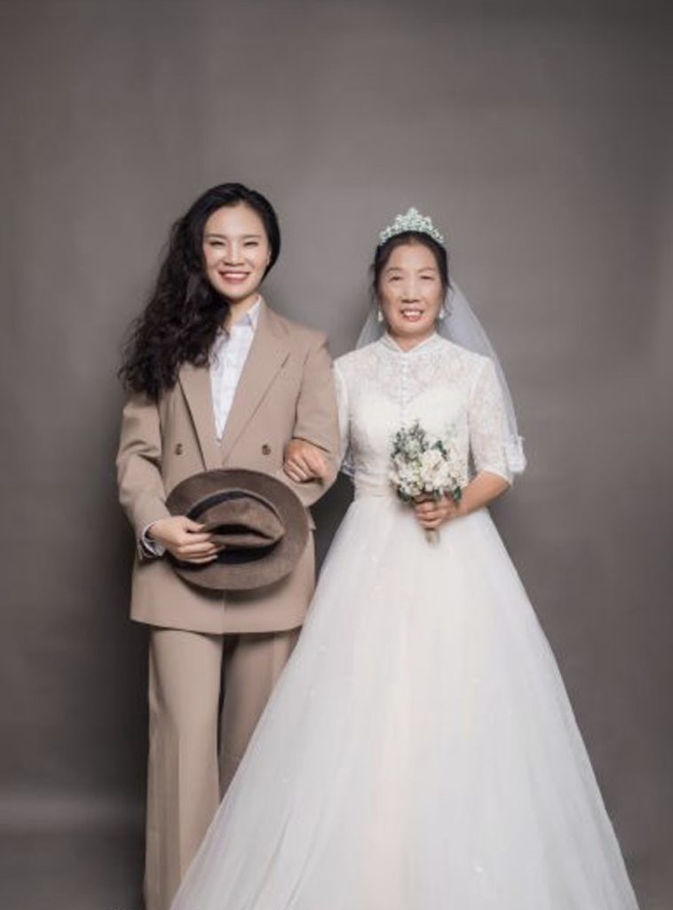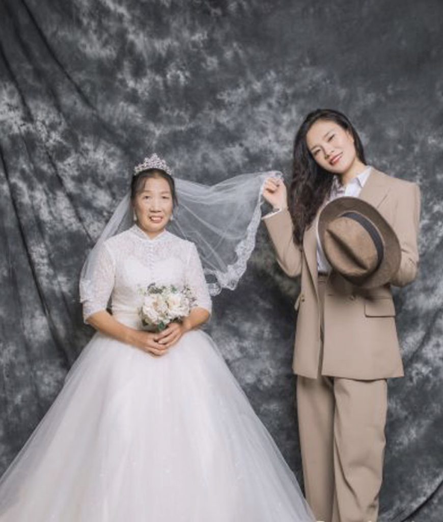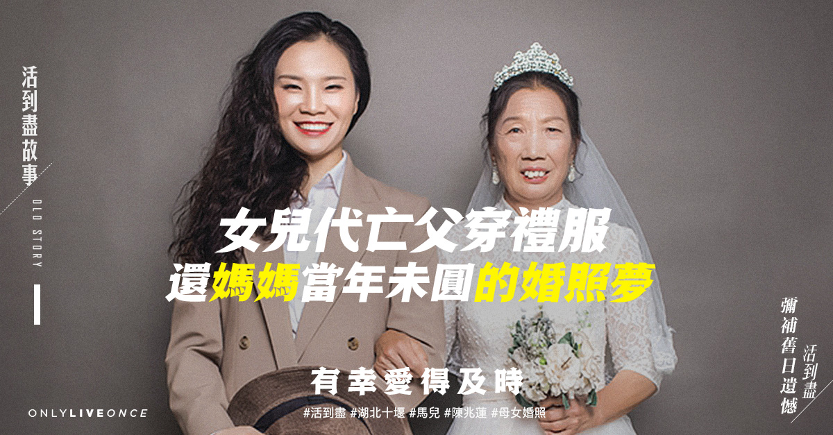 一世穿一次純白嫁衣,是無數女性的畢生心願。惟老一輩多因生活貧困,難有此福氣。像湖北十堰的網民馬兒(網名),心疼其花甲母親陳兆蓮,跟父親成婚時因條件不足,只可簡單領證,後先夫早逝又得勞碌半生,於是她決心「代父穿禮服」陪媽媽合影一輯遲來的婚紗照,彌補舊日遺憾。