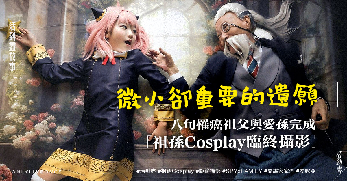 衝破生死禁忌,人們普遍接受以「臨終攝影」,趁生前為自己留倩影,亦於身後給家人留個紀念。日本 Coser「雷(ライ)」就於社交 X(Twitter)分享,其八旬罹癌父親以一輯《SPY×FAMILY 間諜家家酒》Cosplay 家庭照,向子孫們傳揚幽默面對難關的遺願。