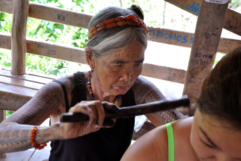 各處鄉村各處例, Whang-Od 所屬部落視紋身為榮耀,古時會以巴托克儀式,加冕「獵頭」殺敵的戰士及其妻室。紋身師會用竹子和柚木刺為工具、水和煤炭為顏料,藉由每分鐘近百次刺戳將墨水注入受刺者的皮膚,最後以椰子油保護其傷口,待癒合後會烙下象徵祖靈的神聖符號。