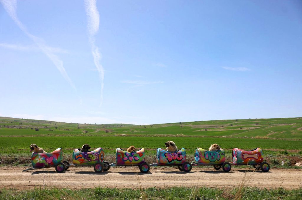 譬如念及狗狗行動不便,Buket 就與同工們動手製作「汪汪列車」——將廢棄的藍色大膠桶逐一開洞、於底部添置輪子、以鏈帶串成列車狀,並接駁至可行駛的卡車後面,再每天由同工擔當「車長」將之駛出收容所,載着浪浪們到附近田野兜風、散心。