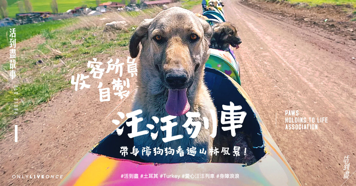譬如念及狗狗行動不便,Buket 就與同工們動手製作「汪汪列車」——將廢棄的藍色大膠桶逐一開洞、於底部添置輪子、以鏈帶串成列車狀,並接駁至可行駛的卡車後面,再每天由同工擔當「車長」將之駛出收容所,載着浪浪們到附近田野兜風、散心。