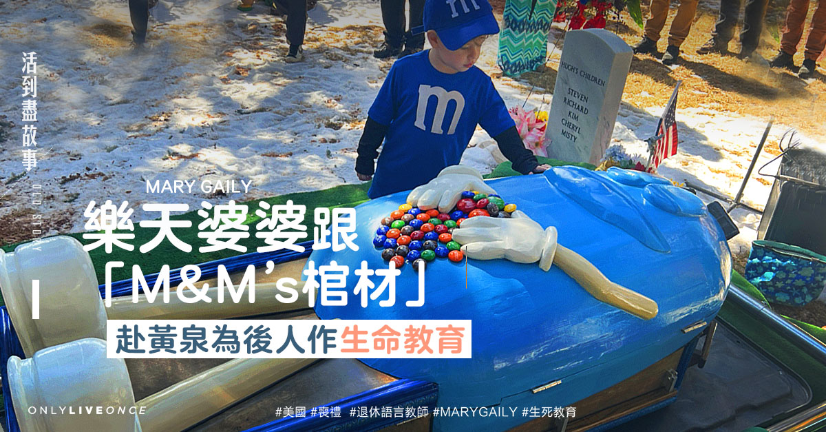 普遍喪禮令人感傷,因儀式及佈置風格嚴肅,樂天知命的美國退休語言教師婆婆 Mary Gaily 反傳統,生前自行策劃未來的喪禮,訂定深愛的朱古力品牌 M&M’s 卡通人物為喪禮及棺材主題,既給自己作最後禮物,也給後人作生命教育。