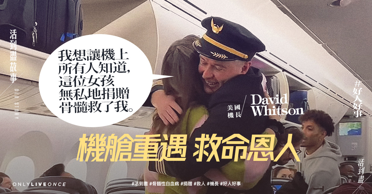 救人需要愛心,亦講緣份。美國機長 David Whitson 念念不忘,約九年前他罹患骨髓性白血病,有緣遇到非血緣女士 Allie Reimold 的無私捐贈骨髓,方可從惡疾中康復過來。前陣子,他在駕駛的航班裡偶遇救命恩人,即趁起飛前與對方打招呼,接續又透過機艙廣播,與乘客分享這件影響他一生的好事。