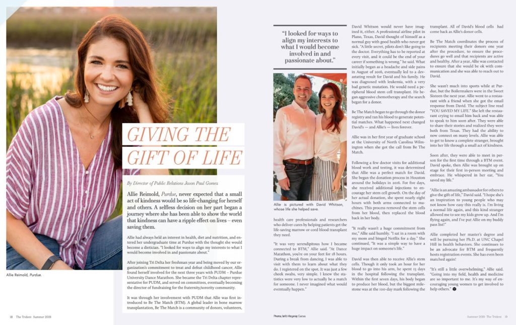 2016 年,David 確診血癌後,面對身體嚴重不適、家屬不符合捐贈條件,曾深感絕望。可幸,經醫療計劃「Be the Match」引介,他意外與大學生 Allie 成功配對上骨髓,並獲她即時答允捐贈以協助療程,最終得以走出鬼門關,並跟太太和子女幸福地生活至今。