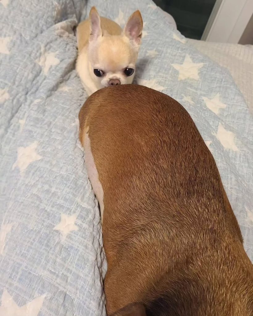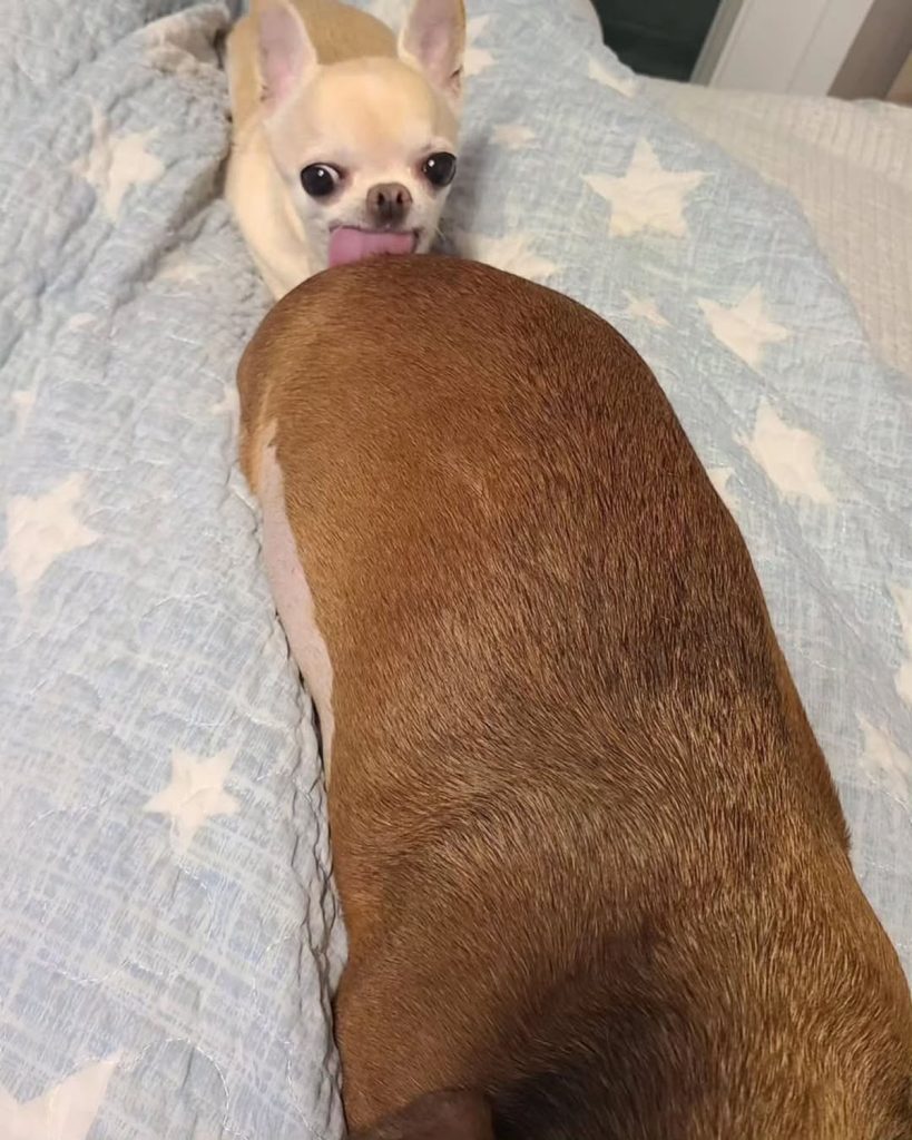 老狗姊妹同屬小型犬,分別是臘腸狗 Jjigi(찌기) 和吉娃娃 Daegi(대기),牠們從小一起成長,按年齡換算相當於人類約 68 歲高齡,兩狗關係極之親暱。多年來Daegi還有個奇怪小癖好,就是每日都老愛緊隨Jjigi身後,不停用舌頭「品嚐」對方的屁股,而Jjig則會自在地任其當個「屁屁小跟班」。奇特的相處模式,連飼主也摸不着頭腦,笑言像極了「人類吃口香糖」般,似是個尋常的生活習慣。