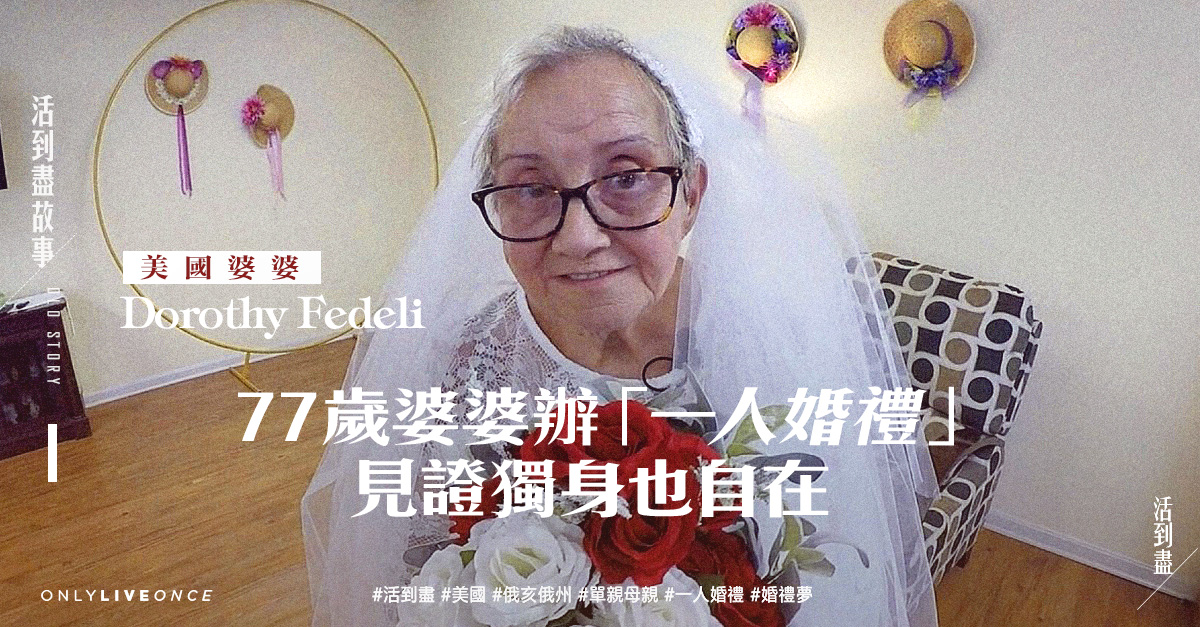幸遇佳偶,自是緣份;若獨自終老,亦無需自憐。美國俄亥俄州的 77 歲婆婆 Dorothy Fedeli 以一場簡單而隆重的「一人婚禮」,證明餘生跟自己好好作伴也自在。