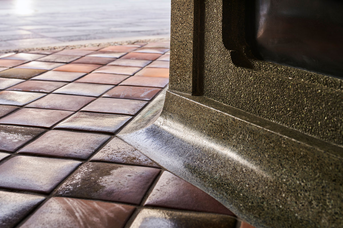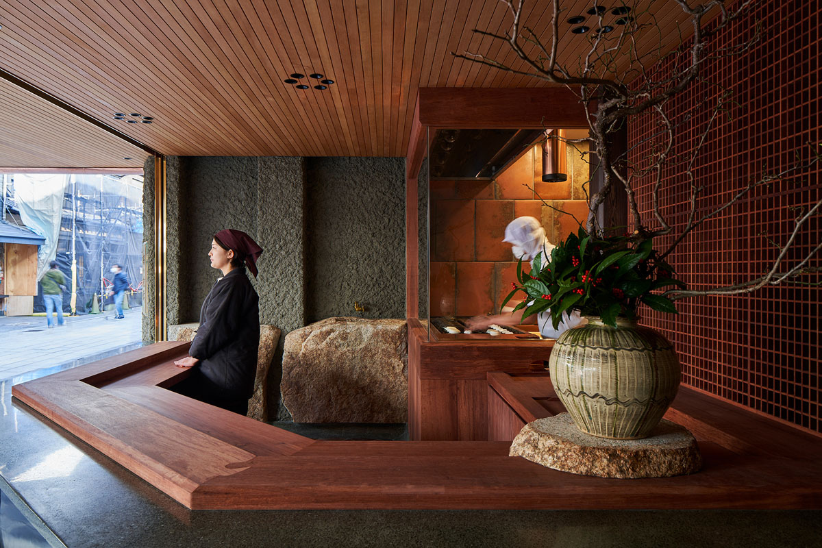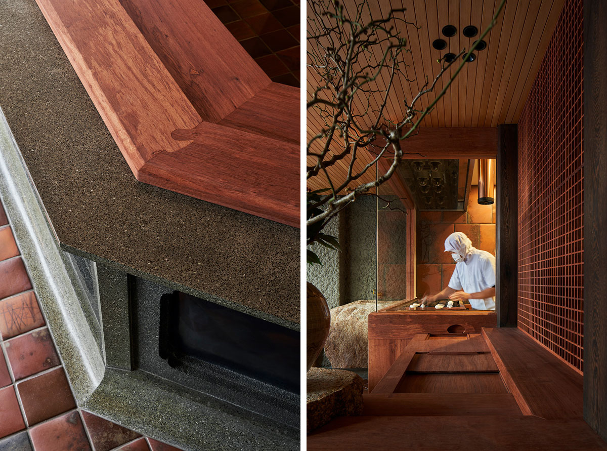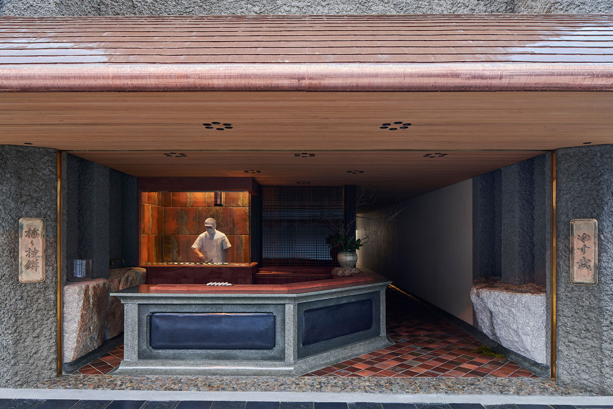 店內的六角形 Bubinga 櫃檯被設定成銷售空間,後方則屬於師傅的食品製作區,食客及路人皆可透過透明的玻璃面板,欣賞師傅的獨門製餅手藝。另外,沿路鋪設的石材與陶瓷交錯的地板長廊,走到盡頭又備有 Mannari 石製洗手盆,其滴下的井水更可滋潤苔蘚,予人淨化心靈之感。