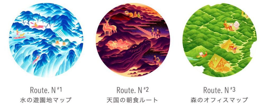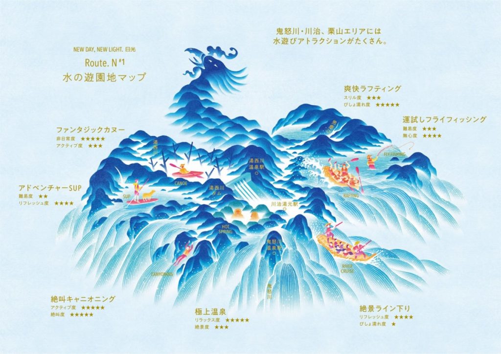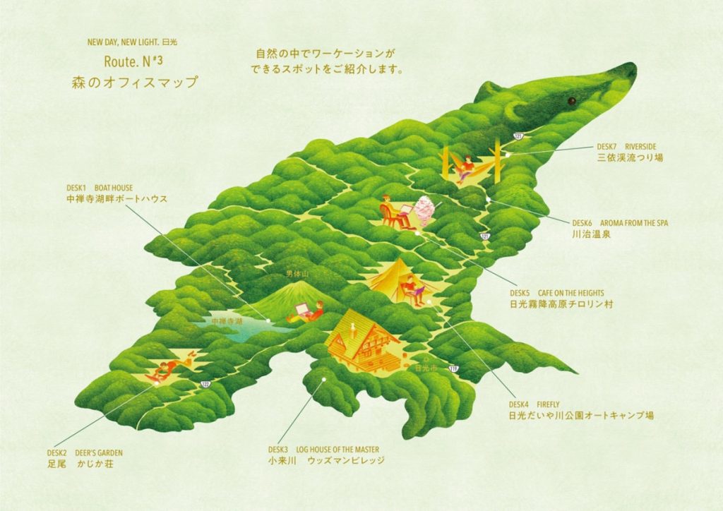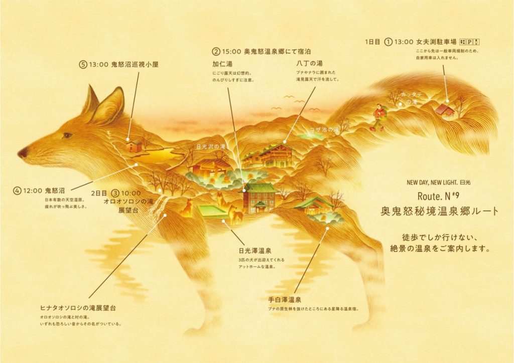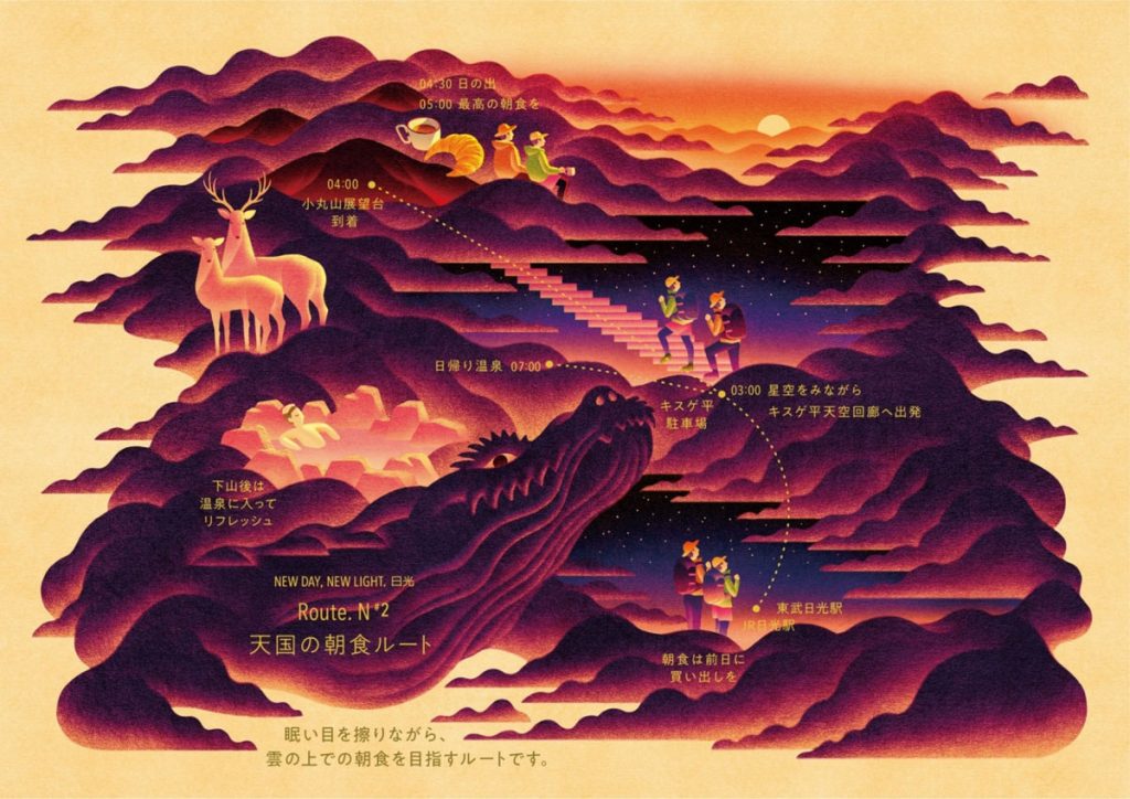 「天國的朝食路線」以惺忪鱷魚的身體作綿延起伏的山幽迴廊,旅人拾級而上看日出、享受醒神早餐,帶出晨之美;「森林裡的辦公室路線」則用綠色巨熊身影,引領寓工作於旅遊的人走進湖畔及高原,體驗「Working Holiday」也快活;「奧鬼怒秘境溫泉鄉路線」更以魅惑的「狐狸」融入漂亮的溫泉絕景,將日光澤溫泉「三柴犬迎賓」的故事再現,靈氣逼人。至於「水之遊樂園」及「足尾町」路線亦各有巧思,部份尚未曝光的,如「究極之瞑想路線」及「秋之現實現實逃避路線」等亦叫人好奇。看每張地圖又標明出遊難度、徒步注意事項、飲食及 Wi-Fi 資訊等,真是美感與實用兼備。