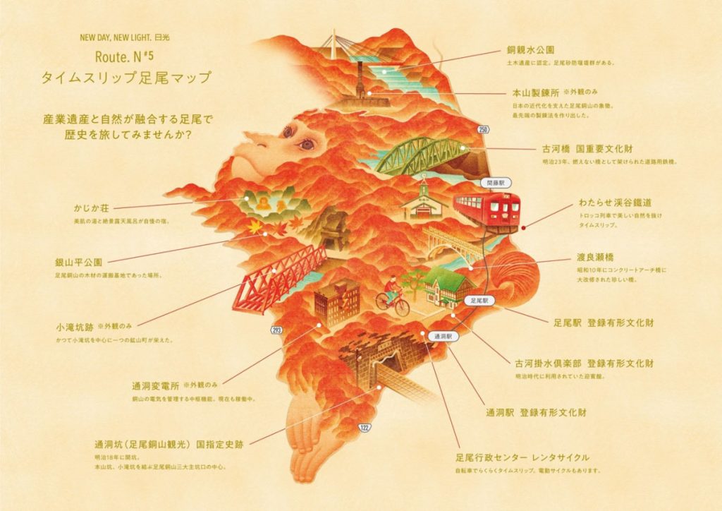 由插畫家矢野繪製的「Route.N」特色地圖更見精美。Route.N 是日光市政府專程規劃的九條觀光路線,用以介紹當地隱藏的新奇景點。為展現跳脫氣息,矢野恵司以「動物身軀」作地圖底層圖像,再於其上繪畫出不同地段及項目的分佈位置。