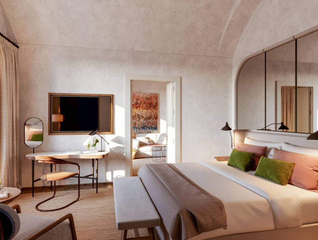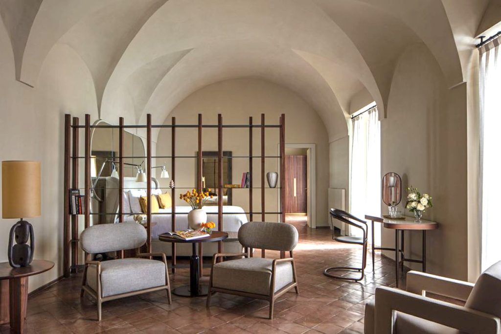 室內設計亦平衡修道院的清幽生活與奢華旅遊所需,選用木材、皮革、天然纖維及貴金屬等天然材料,營造精緻卻不浮誇的氣氛。52 間客房和套房均從修女宿舍改建,保有舊瓷磚、拱形天花板和石灰牆面,融入新穎的紡織品、家品和高科技設備;院長套房可欣賞迴廊景色,氣派的四柱床頂繪有精美壁畫,隱士套房則較私密,可嗅到庭院的檸檬樹香。