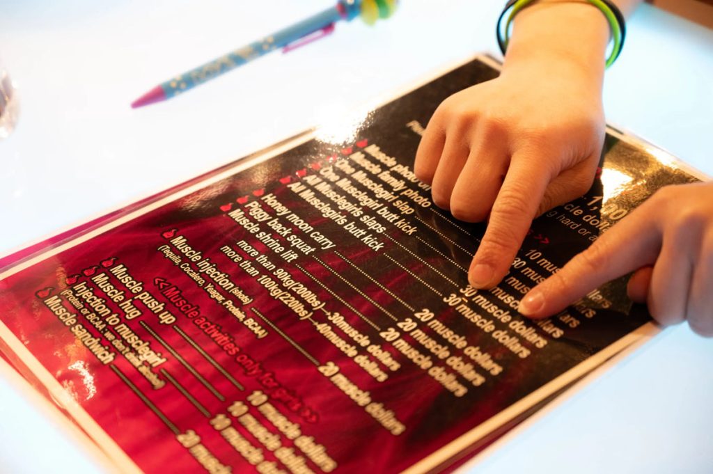好戲在後頭,若是生理女還可加小費選「女性限定」服務,感受被肌肉女店員大力夾成「人肉三明治」、被公主抱合照等,相當瘋狂。當然,一切只是噱頭,絕無危險或情色成分,店家純為逗樂大家,絕不看重勝負或錢銀多寡,只求人人開心又熱鬧。