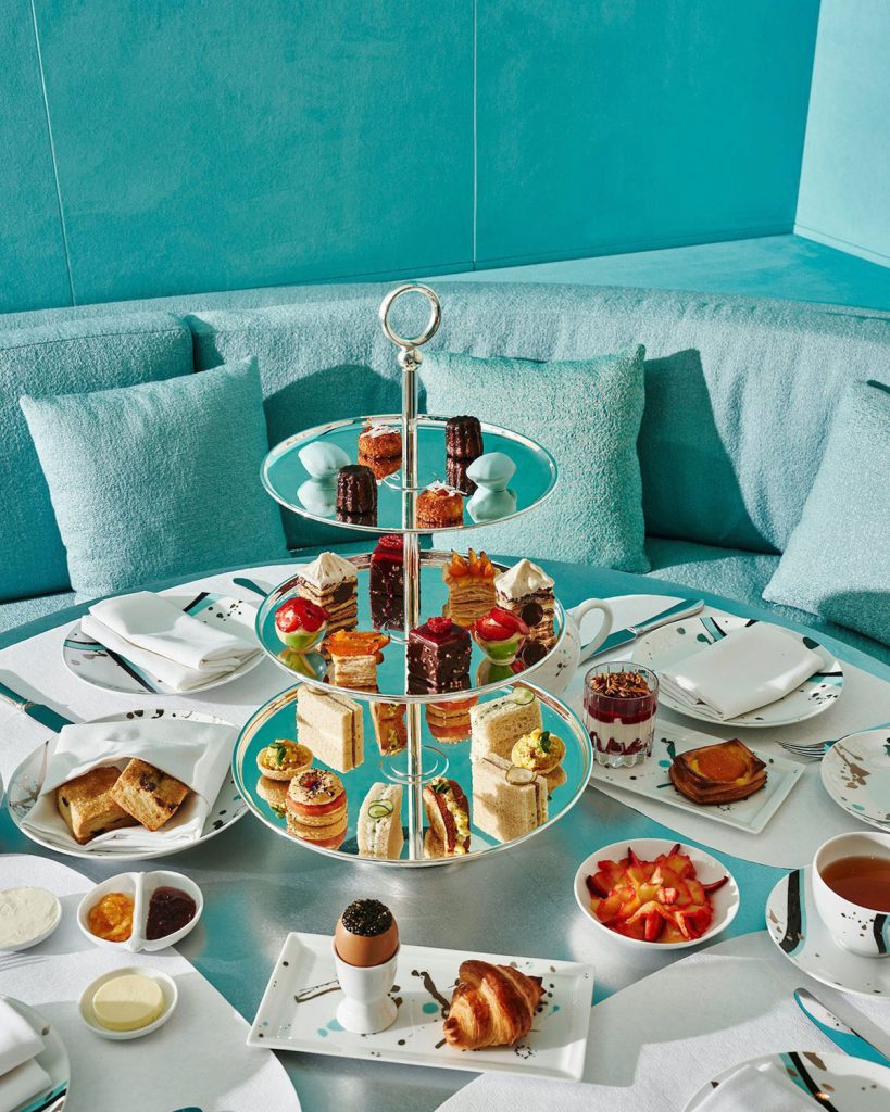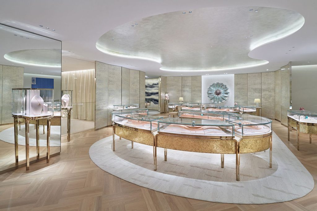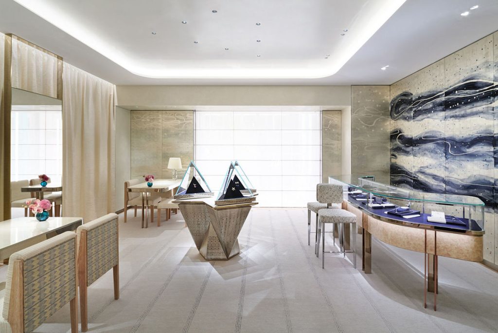 於 Tiffany 銀座店,他承襲 The Landmark 融合工藝、藝術和品牌傳承等元素,以水為意念呼應建築物的波紋曲面,並以流線串連及引導訪客走進各個室內空間,欣賞品牌的「Tiffany HardWear」和「Tiffany Lock」等標誌性系列及各項珍稀珠寶典藏等。而萬眾期待的 Blue Box Café,從牆壁、家具到陳設裝潢亦融入大量品牌特色,呈獻豐富的視覺饗宴。