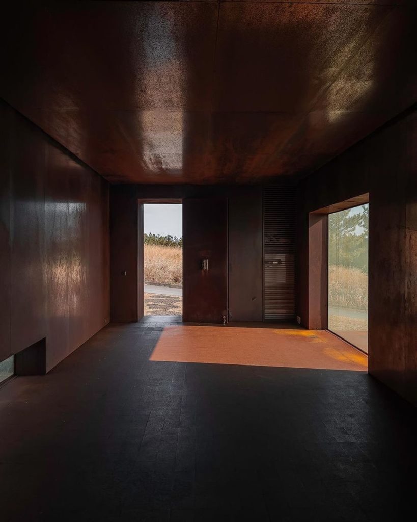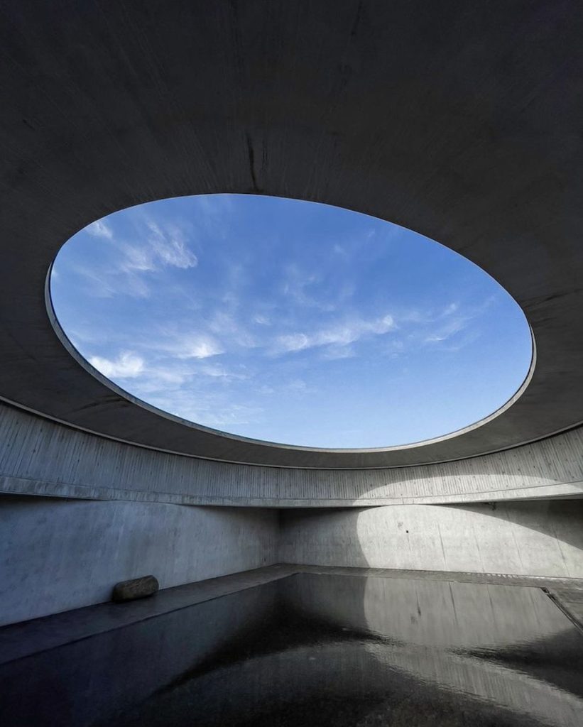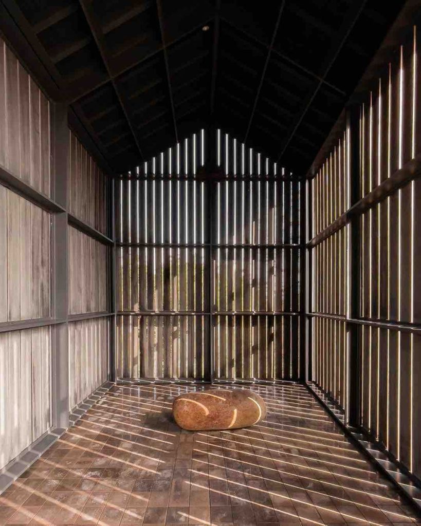「石博物館」用耐候鋼建成,初期呈黃色,隨風雨銹蝕後轉赤紅,寓意大地蒼茫,一大一小窗戶盡覽戶外石景,天花板呈漏斗狀,可將晨日反射室中石頭,展現時間流動。「風博物館」用的日本紅松,會隨年月變淺棕,木材之間又留空隙,借視覺色彩及風吹之聲,將抽象之物具象化,讓觀者看得見、聽得到。石材建成的「水博物館」取「天圓、地方」概念,將橢圓天窗的光影投到水池中央變倒影,以兩者互動反映世態無常。