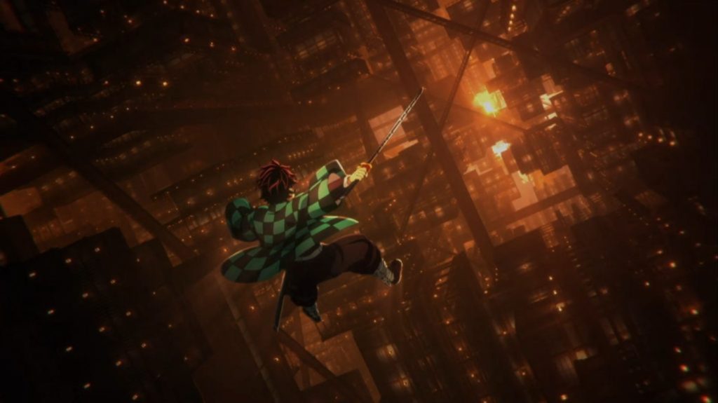 《鬼滅之刃》講述大正時期,主角炭治郎為救意外變成「鬼」的妹妹禰豆子,加入了對抗鬼王舞辻無慘的「鬼殺隊」及展開冒險。末段大戰,眾人闖進鬼王手下鳴女創造的異世界無限城,並於木造的日式建築「漂浮舞台」(浮き舞台)激鬥連場,鳴女則用血鬼術演奏琵琶操控環境,堪稱作品的高潮情節。