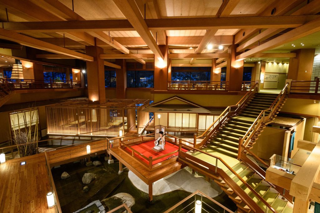 回到現實,老字號「大川莊」創業於 1953 年,迎賓大廳及舞台則建於 1989 年,其建築風格和結構,採用故事中類近的傳統和風、設四面階梯樑柱及開放式中庭設計。即使舞台不會有鳴女現身彈奏琵琶,可是每日傍晚卻會呈獻典雅的三味線現場表演,自然成為動漫迷寄託參觀「無限城」的最佳選擇。