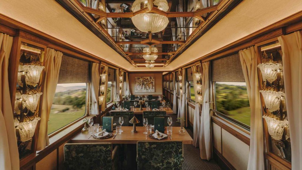 創意總監 Ottalie Stride 以「華麗珠寶箱」為概念,精選上乘的設計品和藝術品,點綴氣氛。例如豪華套房的橡木鑲板搭配Olly Fathers 的平面藝術,氣派優雅;房內壁紙及扶手椅結合意大利Rubelli高端織品,致敬傳統工藝;貝殼藝術家Mel Campion的古典方鏡、Marcus James的多色鋼筆湖景插畫及Sarah Woods談冥想的海景版畫;觀景車廂的復古酒吧,取材19世紀英國藥劑舖的深色木櫃、玻璃瓶罐及懷舊格局,讓旅人邊品酒邊自在社交。