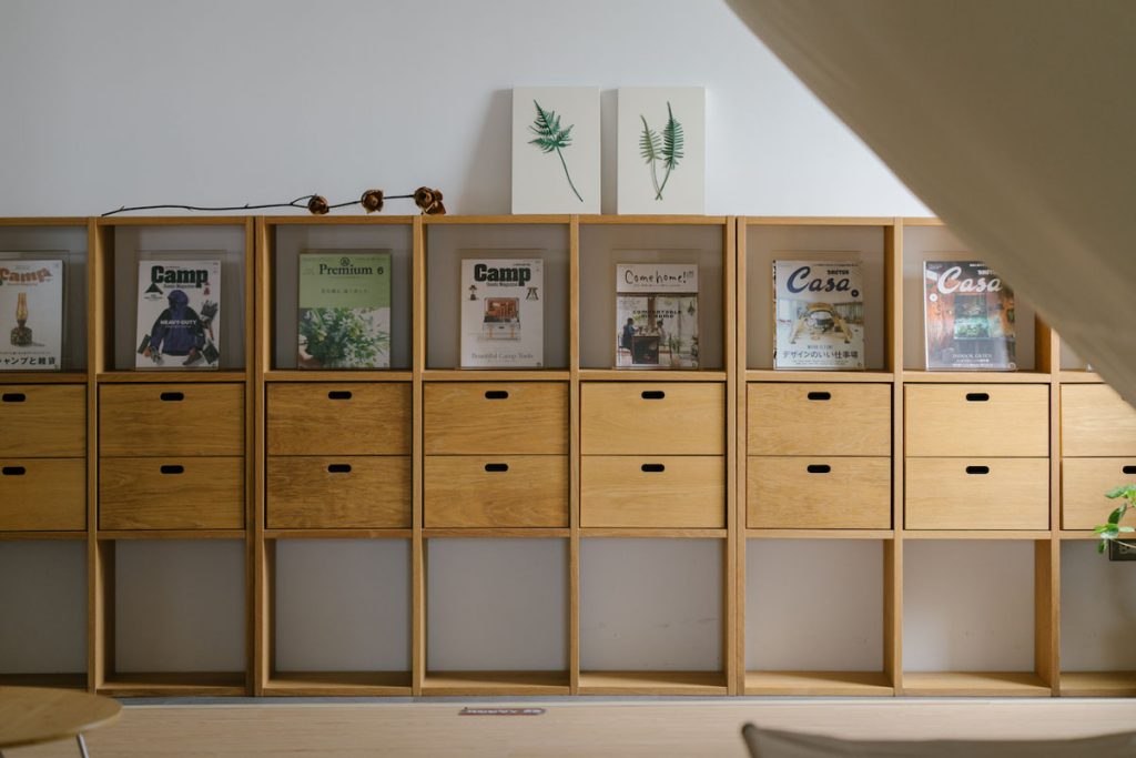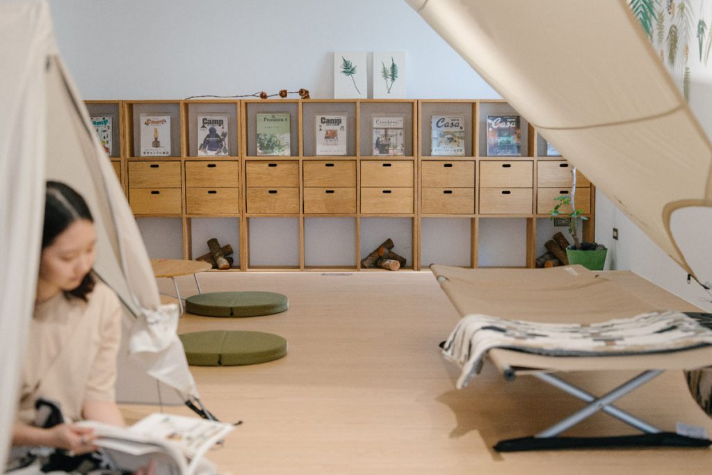 天幕區掛有剪紙藝術家 Wuba Yang 的紙蕨作品,配合折疊行軍床、坐墊及 boven 雜誌圖書館雜誌提供選書,是寧神好地帶;TUGUCA 區則有日本檜木製成、結合室內樑柱的陳列空間。每個區域安排完善,使人減壓又能提升創造力。