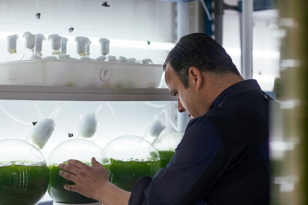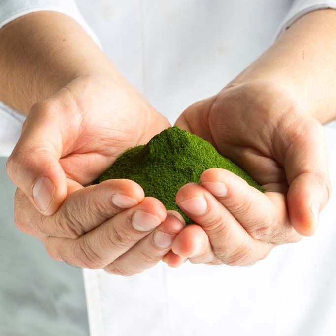 經 FM 公司協助,León 起初從海中撒網 5 小時、提取 1 公克微藻,後再將捕撈改為水箱養殖。歷時多年,雙方終以冷凍風乾技術,成功提煉出調味用的「微藻粉末」。這種呈濃綠色的粉末,飽含蛋白質、礦物質、維他命、ω−3 和 ω−6 脂肪酸等多元營養,還別具天然的鮮味,