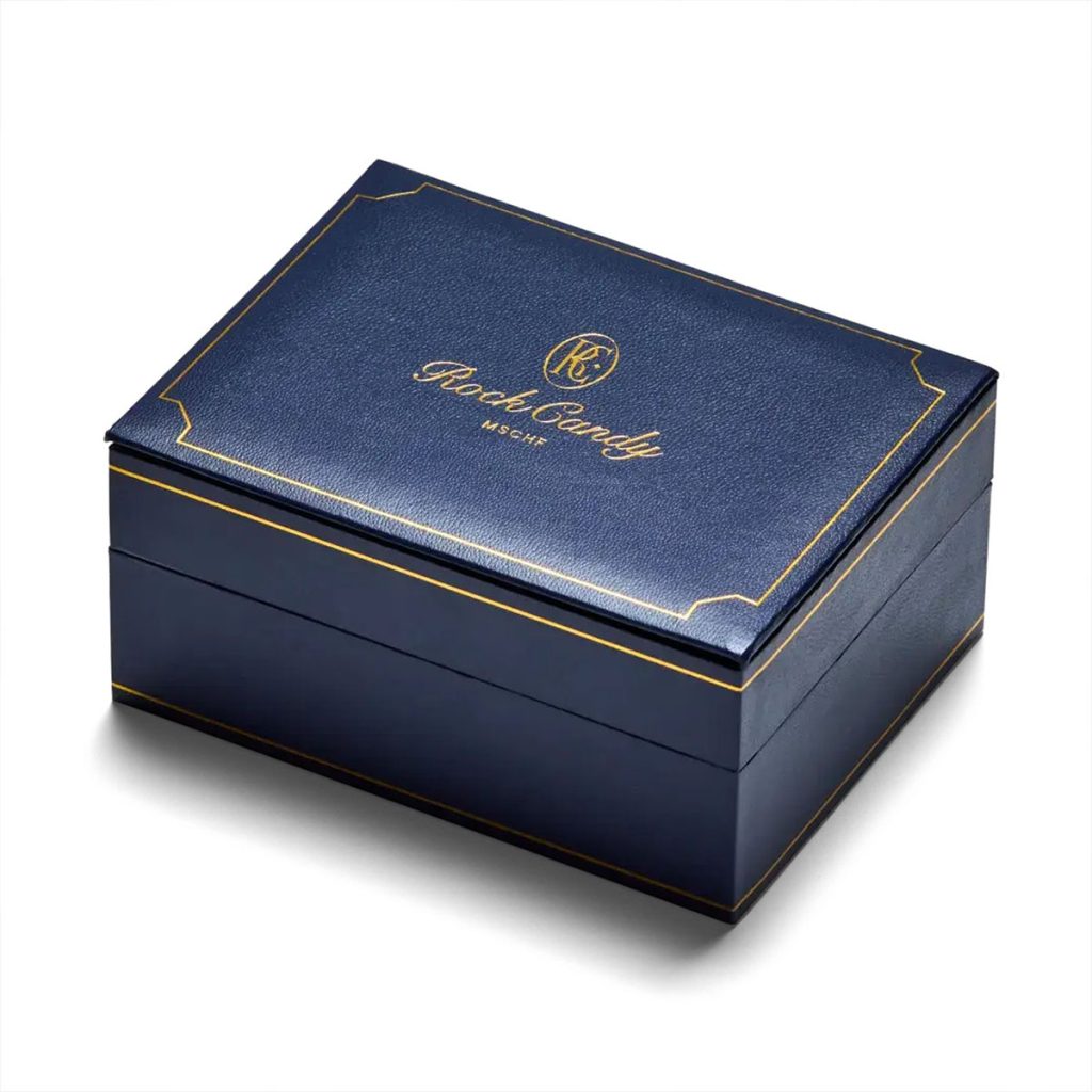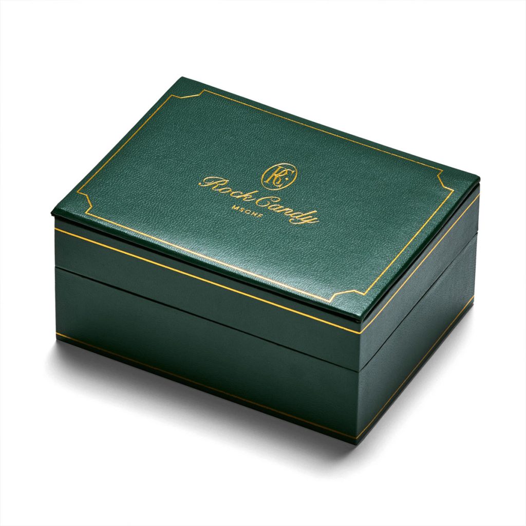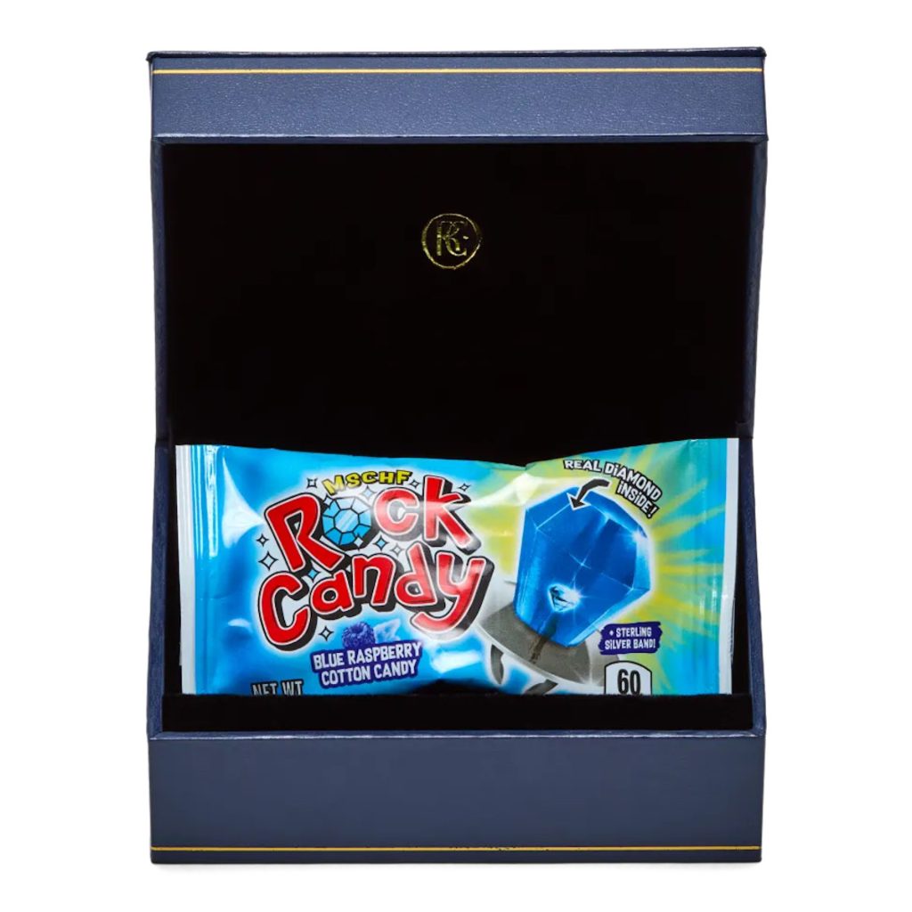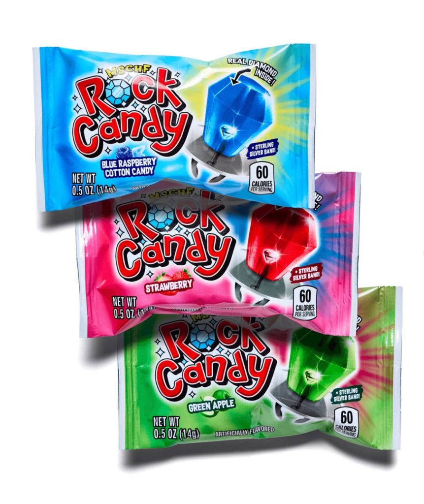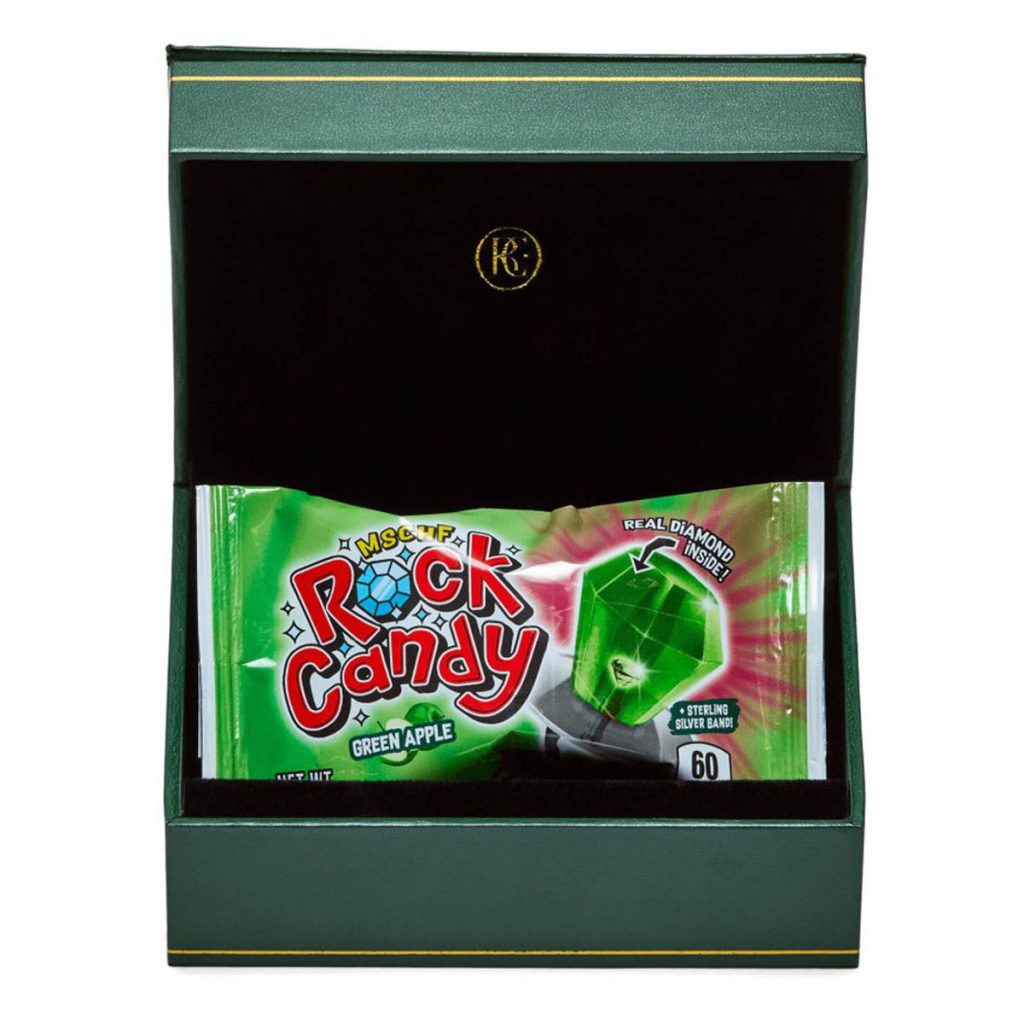 於 90 年代至千禧年間,戒指糖曾以「膠製指環上鑲有寶石糖果」的可愛形態,深受青少年所喜愛,尤其那年紀多數人負擔不起高昂的禮物,向摯友或意中人贈送一枚甜蜜的戒指糖,往往可創造美好回憶。這啟發 MSCHF 沿此構思出「Every kiss begins with M. Rock Candy」的概念,設計了包括「青蘋果、草莓和藍覆盆子棉花糖」三款經典口味的 Rock Candy。