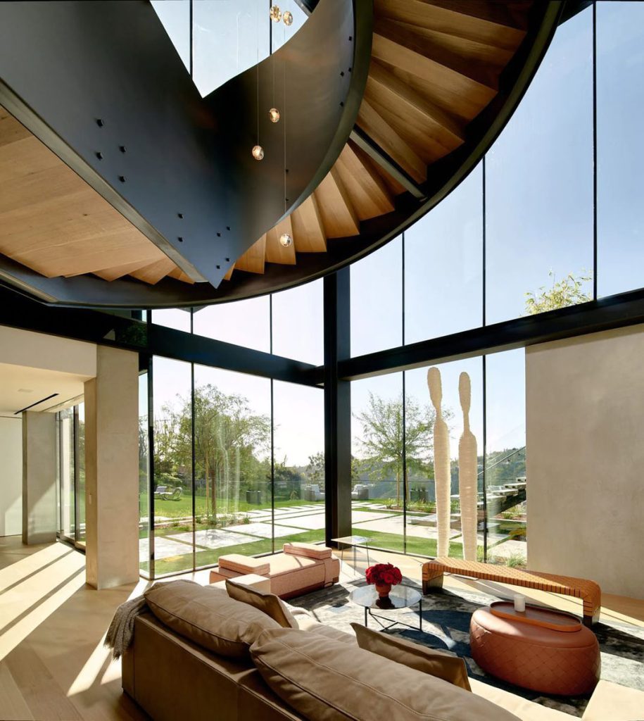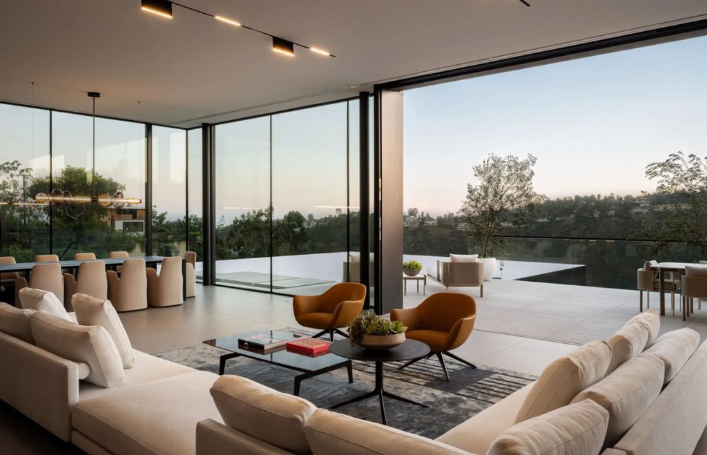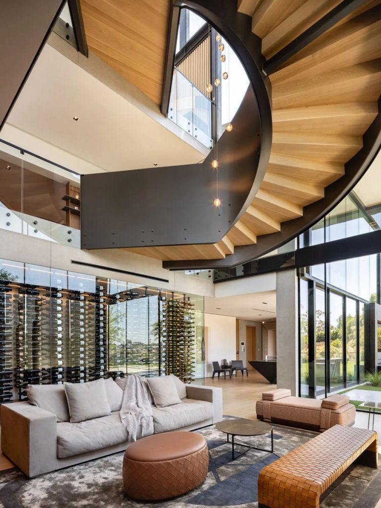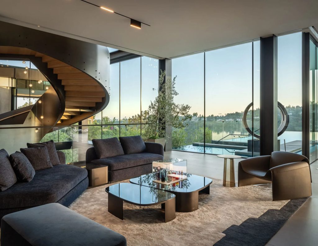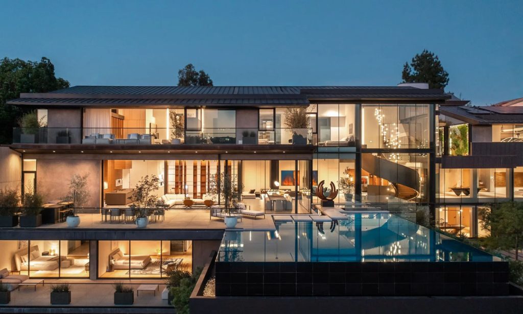 莊園座落的「1859 Bel Air Road」,是洛杉磯名流商賈匯聚的超豪華地段,全建築共花 7 年建成,並於市場上以高達 6,800 萬美元銷售。其佔地 2 萬平方英尺,主體外觀呈簡潔曲線及幾何形狀,用巨幅玻璃包裹四邊,仿如一艘飄浮在半空的宇宙船,獲業界譽為「1859 現代主義奇蹟」。居室入口那道由鋁和鋼特製的螺旋樓梯,定錨其前衛氣派,三層樓內又分別設有下沉式開放廳堂、9 間臥室,12 間各備浴缸、蒸汽淋浴和雙梳妝台的浴室,加上 TechnoGym、酒廊、無邊泳池及水療中心等,還有 Giraldo 親自挑選的高訂家具,絕對可滿足一切起居和娛樂需求。