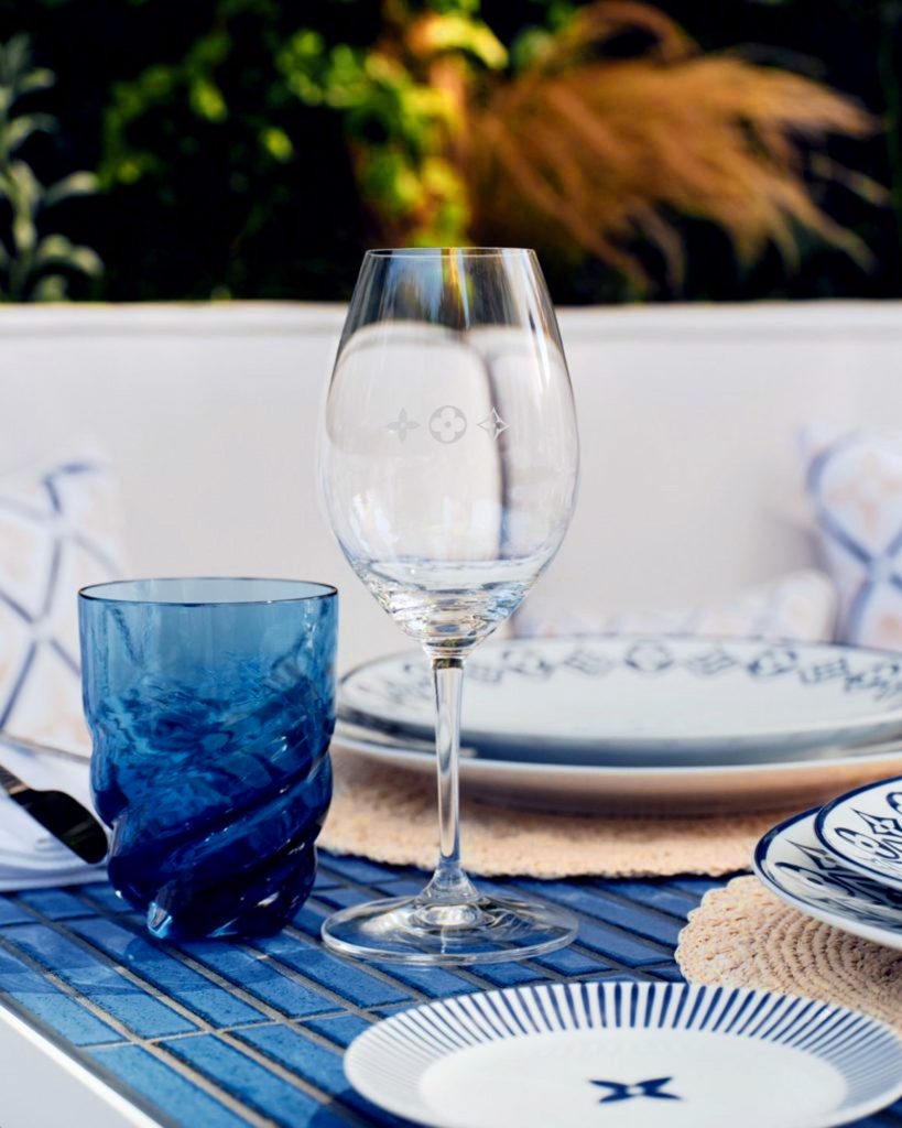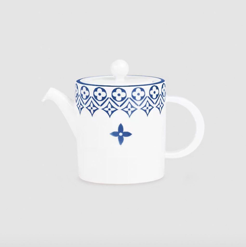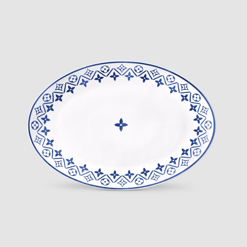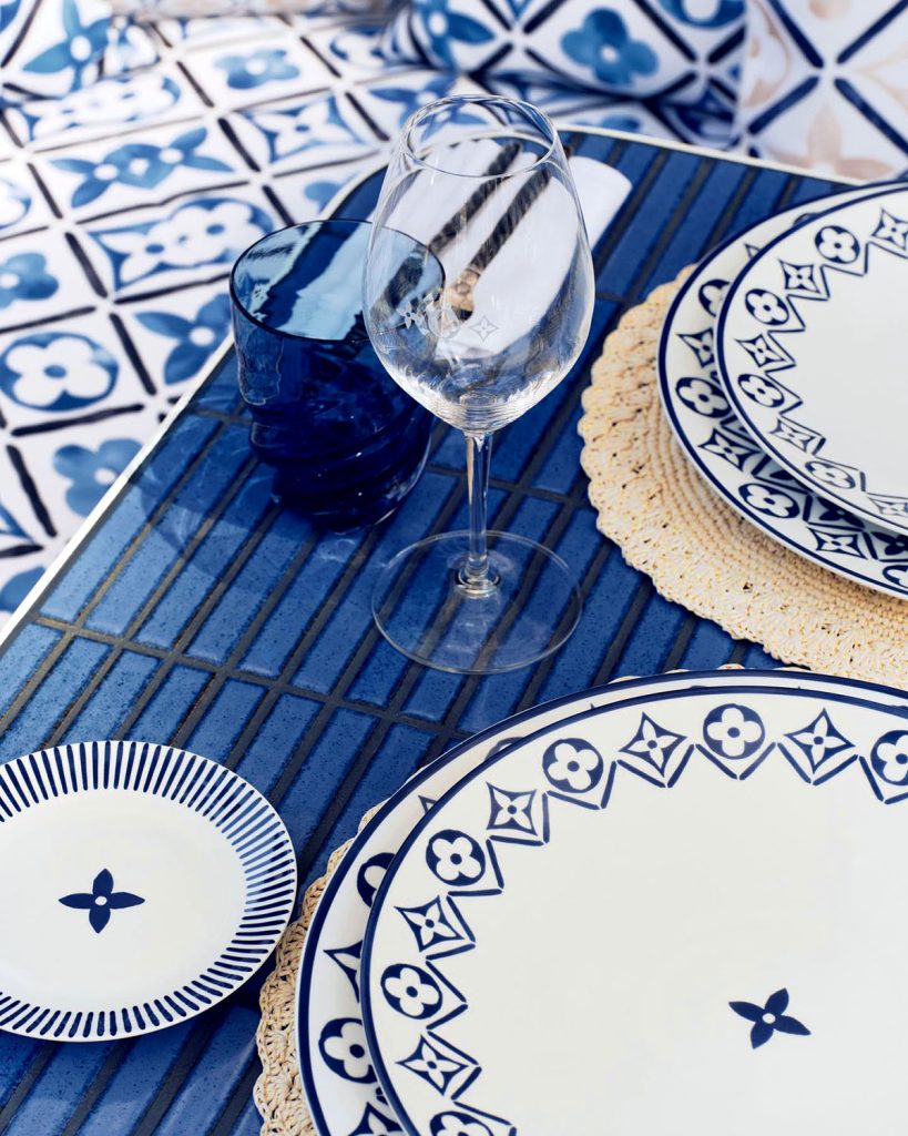 LV 首系列瓷器餐具受歷史啟發,請來利摩日瓷廠製作一系列頂級「Monogram Flower Tile」白瓷碗盤、酒杯和茶壺,再於其上融入青花瓷技巧,描畫品牌著名的 Logo 花圖案,以兼具功能性和裝飾性的優雅食器,盡展品牌尊祟傳統文化,同時力求承傳與創作的工藝精神,並為餐桌營造新穎而永恆的美意。