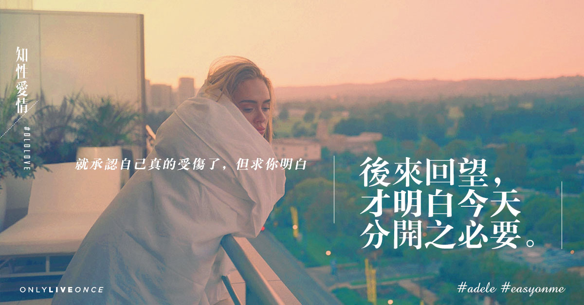 萬眾期待的 Adele 新歌你大概都聽了無數遍。卻是在一聽再聽之下,才更為背後的心情而落淚。她說,這是給兒子將來聽的。她的離婚不單是對自己的創傷,對兒子何嘗不是?他今天或許不明白,母親只盼他將來可以理解她今天為何要做這樣的決定。一首歌,承認自己的失去、挫敗、迷失,不求別人今天聽得懂,但總有一天,別人也會知道一個人為了追尋人生的快樂,有時不得不做出一些傷害自己和別人的決定。