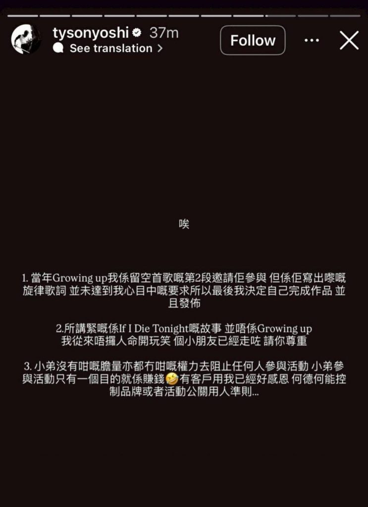 ProdiG 連日發言,羅列 Tyson 幾大罪狀:他發佈一條以 Tyson 歌曲《Growing Up》做背景音樂的短片,指控對方將過去的合作歌變成自己 Solo,還懶好心作故仔扮鼓勵癌症兒童;又利用名人身份打壓其他音樂人。言論使群眾嘩然也好奇,向來火爆的 Tyson 可會用創作 Diss back 還擊?想不到,Tyson 出奇冷靜,截至寫稿日(6/8)僅發出一則限時動態的文字聲明及探訪癌症粉絲合照,嚴肅地逐點否認指控:他直言《Growing Up》不起用 ProdiG 的旋律和歌詞,只因成品不符合其要求的水準;他安慰病童所創作的歌曲,實屬另一首《If I Die Tonight》,再者小朋友現已病逝,本身亦「從來唔攞人命開玩笑」,望其予以尊重;至於品牌或公關活動,他僅屬被動的受邀者,「目的只為賺錢,無咁嘅膽量亦都無咁嘅權力阻止任何人參與」,似有意冷處理也如《Growing Up》曲中寄意提對方:「人生苦短,get a life」。
