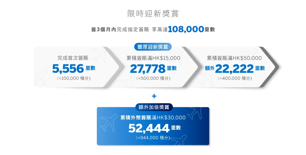 - 基本卡批核後首3個月內完成首次簽賬專享100,000積分,可兌換5,555里數