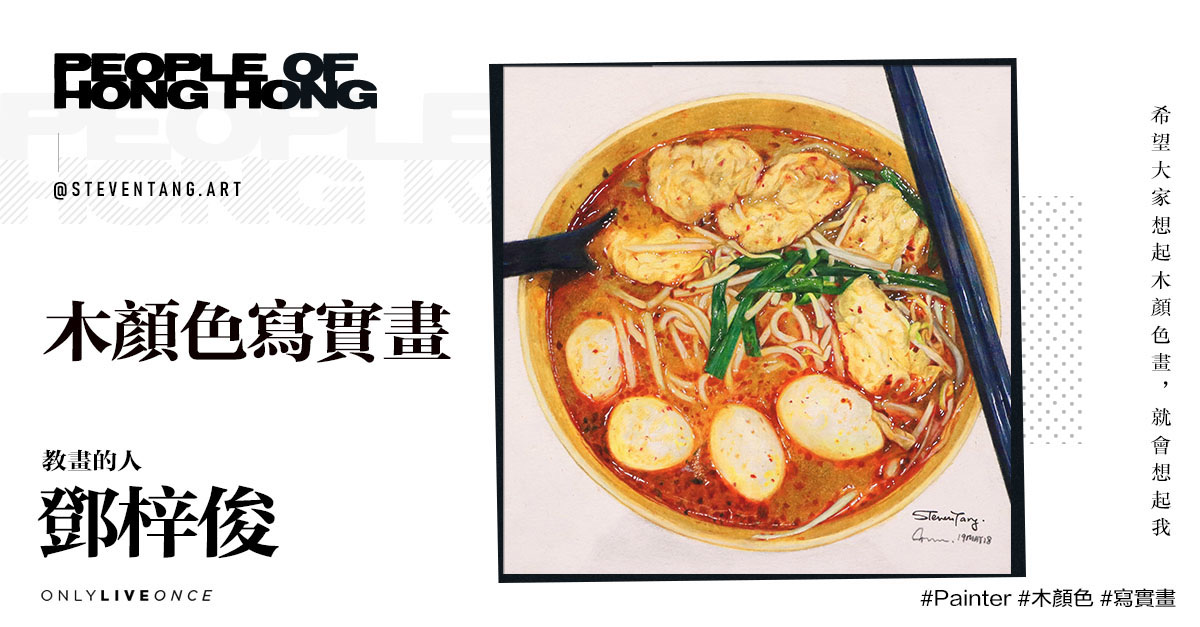 「義父」、「墨演」,滿佈辣油的湯底,再加上標誌性的黃色大碗,隔著畫紙彷彿也聞到陣陣香味 —— 鄧梓俊 (Steven) 於四年前就是憑著這幅唯妙唯肖的譚仔米線而受到矚目,令他重拾夢想,毅然放棄計算機科學專業,全職投身藝術。