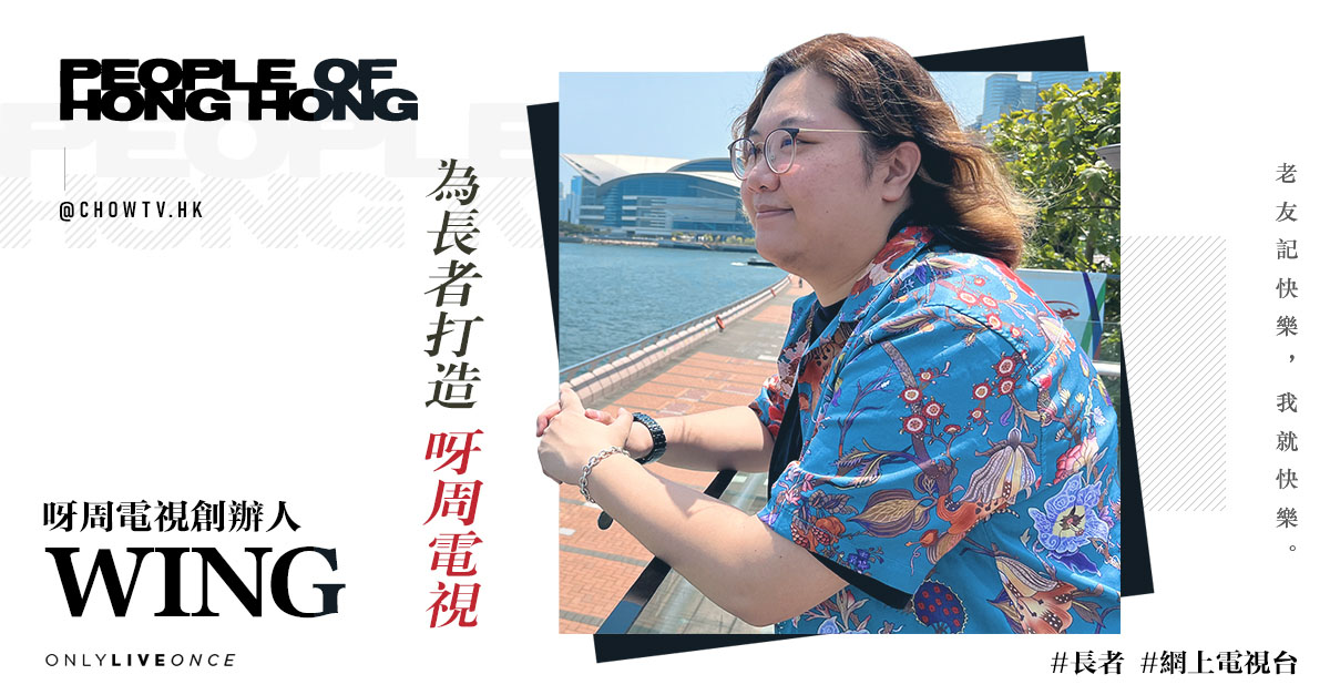 趁著大學有 funding,Wing 開始了呀周電視的構思。這電視台專為 50 歲以上的長者而設,節目於 YouTube、facebook 及 Instagram 播放,內容夾雜趣味與資訊,希望老人家能會心微笑。「上次街訪一班老友記講少女心事,好搞笑,明明唔識我,卻一五一十透露自己以前的拍拖細節,分享完含羞地笑,很可愛。」在 Wing 心目中,老人家都是寶。「很多老人家,特別是住老人院的一群,接收資訊往往只能靠電視上的新聞,然而那些對他們來說都不是最貼身的,加上新聞報導內容重覆沉悶,我希望我的節目可以為他們在疫情下注入歡樂,甚至用得著,例如知道他們無得出街,我便拍了『幫你出街』帶大家睇聖誕燈飾,一於睇咗當去咗。」Wing 的節目,包含長者故事、吃喝玩樂、兩代話題及運動,範疇多元化,娛樂老友記的同時,也想他們知道自己老而不廢。「年紀大,時間相對多了,不是更應該去做想做的事嗎?所以長者的正面訪談很重要,由他們帶出『身體差了不等於什麼也做不了』的訊息。」Wing 拍攝時會邀請長者義工參與,又會辦興趣班,讓老人家吸收新知識,疫情前更曾帶他們去 busking,個個玩到樂而忘返,臨走更送了一束花給阿 Wing 表示謝意。