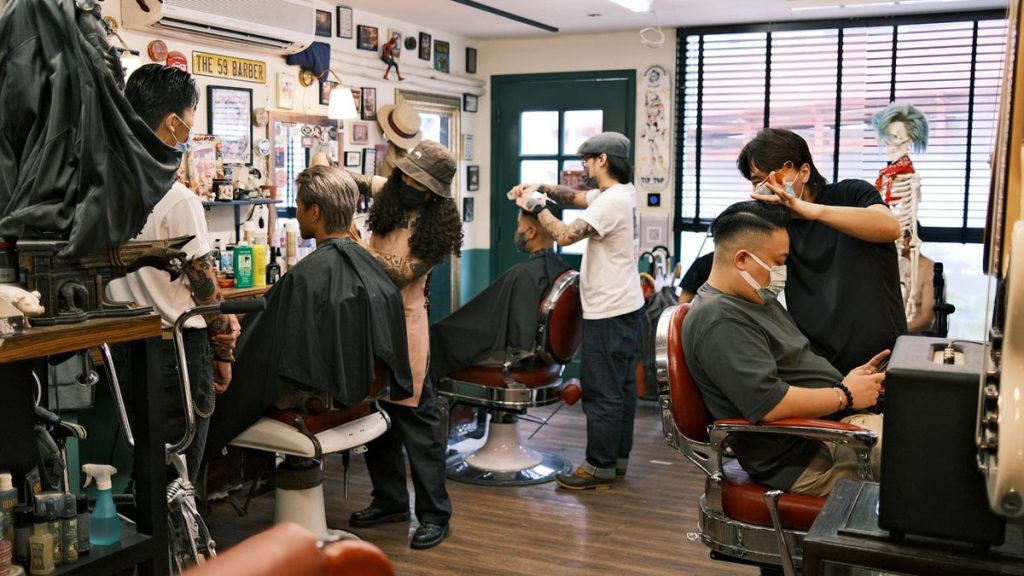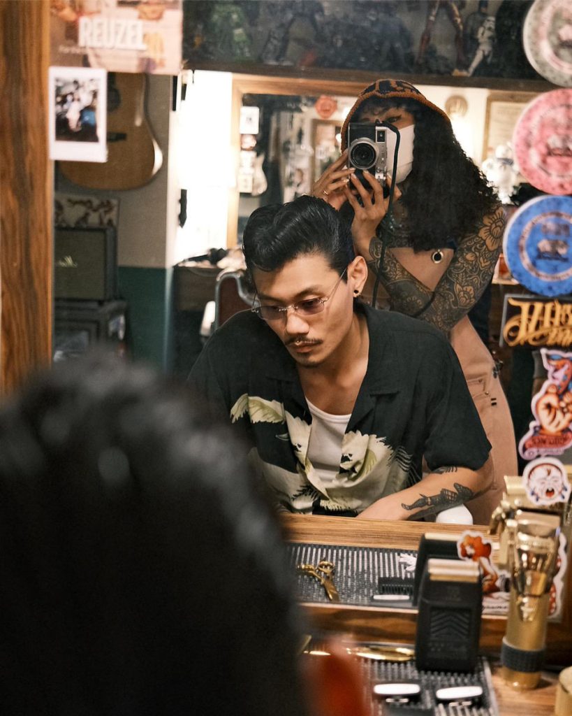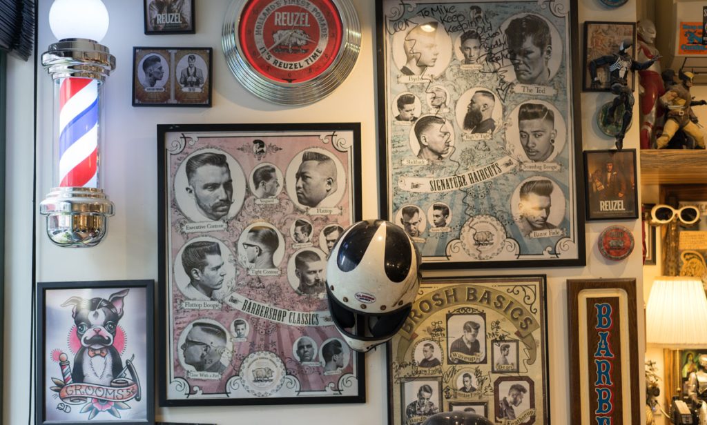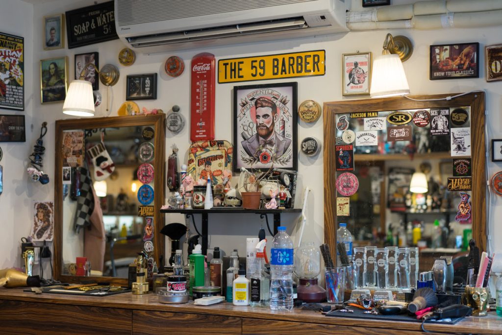 Julian 沒有像其他 Barber 一樣剷青、剪油頭,而是頂著一頭復古味十足的標誌性捲髮,穿著西裝外套,打扮得充滿時尚感。「我很喜歡復古,家裡很多家俬、擺設都是復古,在二手店買回來的。」抱著對復古文化的熱愛,Julian 和一班朋友開始接觸 Barber 這個行業:「因為 Barber 正是復古文化,當時一班同樣喜歡復古的朋友便以玩味形式開了這家 Barber Shop,想讓朋友們有個地方聚腳。」Julian 身處的 The 59 Tattoo And Barber Shop 自 2016 年開業,裝潢充滿復古味道,到處擺滿懷舊玩具、裝飾擺設,貼滿各種油頭造型海報,這裡也是 Julian 開始接觸、入行成為 Barber 的地方。