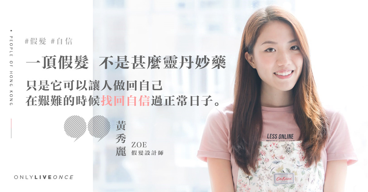 Zoe 的中文名是黃秀麗。秀麗,馬上就能聯想起一頭「秀麗的頭髮」。也許是命中注定,這個頭髮又長又密、說起話來溫文爾雅的 90 後女生現在是一位假髮設計師,主要幫助癌症病人或有脫髮問題的人士還原一把屬於他們的頭髮。