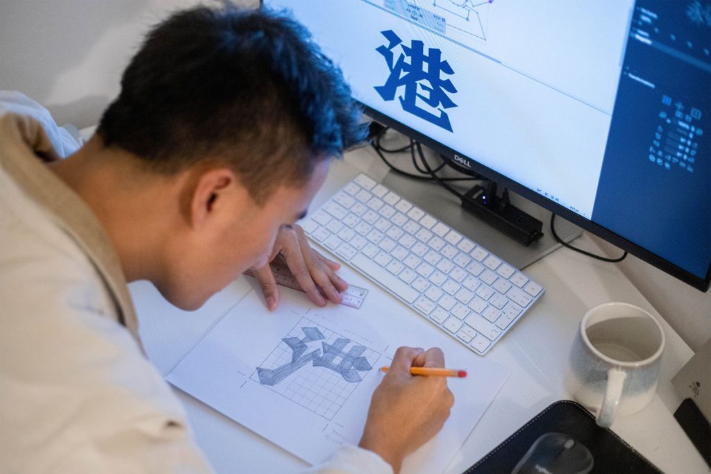 現在每日平均造 25 至 30 字,有時要花上 3 到 4 小時才能造好一個字。「越少筆畫反而越難,例如『家』,每一筆都要不停更改粗幼度。」