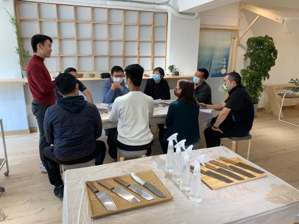 當年他在廚藝學院讀西廚,學校的刀無張利。一切,硬碰硬,刀隨洋蔥皮滑走,番茄裂開爆汁,雞皮拖曳,劏魚得大大力劈。他請教老師,發現磨刀施力不均,角度歪斜,招致損耗。此事喚起他的研究魂,翻書刨片,苦練三月,終掌握利刀要義,助人自助:「刃口尖頭變圓,面積增加,力度分散,就切不開,所以磨刀時手要穩,將刃口削至 V 型,兩端對稱,力度自然集中。」